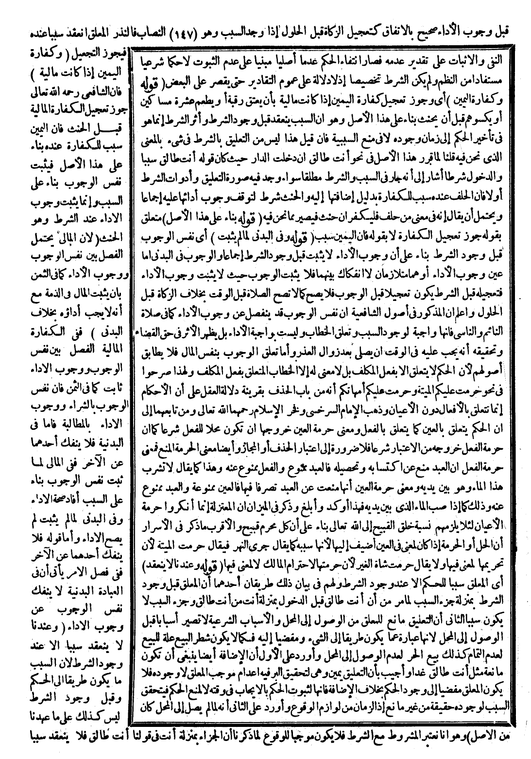 (قَوْلُهُ: فَإِنْ قَالَ) تَفْرِيعٌ وَتَمْثِيلٌ لِصِحَّةِ إطْلَاقِ الْمُسَبِّبِ عَلَى السَّبَبِ إذَا كَانَ السَّبَبُ عِلَّةً مَشْرُوعَةً لِلْحُكْمِ، وَالْمُسَبِّبُ حُكْمًا مَقْصُودًا مِنْهُ بِمَنْزِلَةِ الْغَائِيَّةِ، وَإِنَّمَا وَضَعَ الْمَسْأَلَةَ فِي عَبْدٍ مُنْكَرٍ لِأَنَّهُ لَوْ قَالَ: إنْ مَلَكْت هَذَا الْعَبْدَ أَوْ اشْتَرَيْته يُعْتَقُ النِّصْفُ الْآخَرُ فِي فَصْلِ الْمِلْكِ أَيْضًا لِأَنَّ الِاجْتِمَاعَ صِفَةٌ مَرْغُوبَةٌ فَيُعْتَبَرُ فِي غَيْرِ الْمُعَيَّنِ، وَيَلْغُو فِي الْمُعَيَّنِ لِأَنَّهُ يُعْرَفُ بِالْإِشَارَةِ إلَيْهِ.