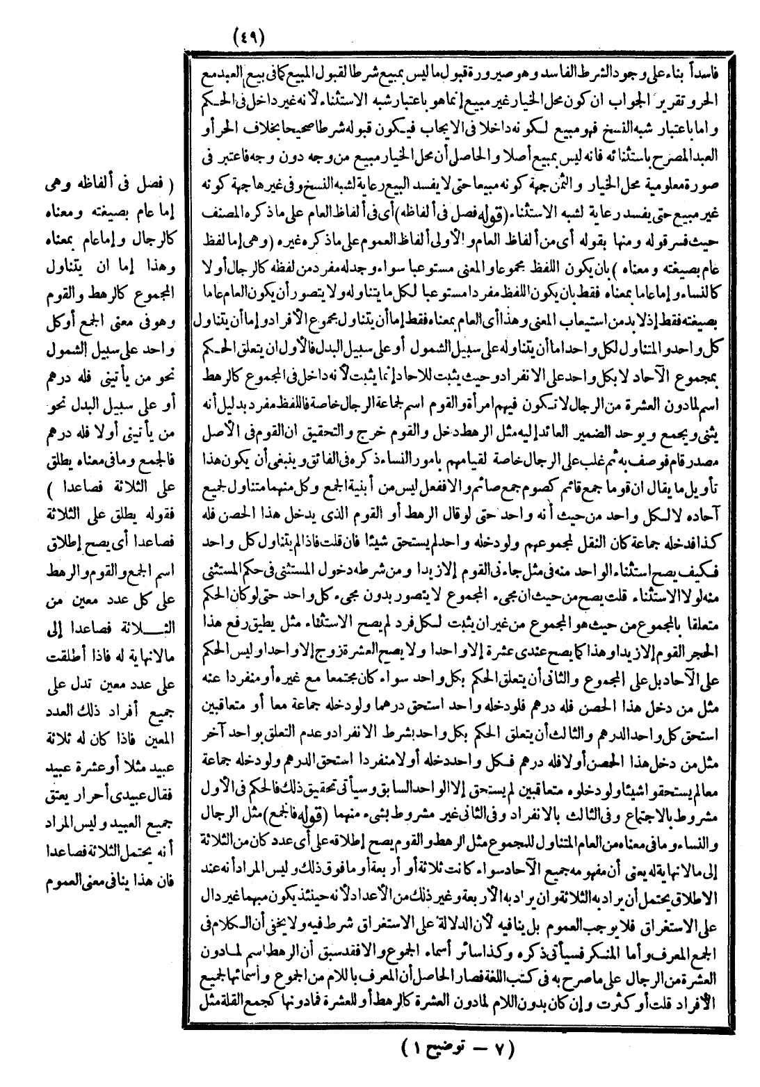 ـــــــــــــــــــــــــــــQلِلْمَاهِيَّةِ سَوَاءٌ عُرِّفَ بِهِ الْكِتَابُ أَوْ الْقُرْآنُ إشَارَةً إلَى أَنَّهُ لَا فَرْقَ فِي لُزُومِ الدَّوْرِ بَيْنَ الصُّورَتَيْنِ، ثُمَّ قَالَ، وَإِنَّمَا يَلْزَمُ الدَّوَرَانُ لَوْ أُرِيدَ تَعْرِيفُ مَاهِيَّةِ الْقُرْآنِ إشَارَةً إلَى أَنَّ مَاهِيَّةَ الْكِتَابِ هِيَ مَاهِيَّةُ الْقُرْآنِ فَذِكْرُ أَحَدِهِمَا مُغْنٍ عَنْ ذِكْرِ الْآخَرِ، فَإِنْ قِيلَ يُفَسَّرُ الْمُصْحَفُ بِمَا جُمِعَ فِيهِ الصَّحَائِفُ مُطْلَقًا عَلَى مَا هُوَ مَوْضُوعٌ فِي اللُّغَةِ وَيَخْرُجُ مَنْسُوخُ التِّلَاوَةِ عَنْ التَّعْرِيفِ بِقَيْدِ التَّوَاتُرِ فَلَا دَوْرَ قُلْنَا عُدُولٌ عَنْ الظَّاهِرِ إلَى الْخَفِيِّ وَعَنْ الْحَقِيقَةِ إلَى الْمَجَازِ الْعُرْفِيِّ فَلَا يَحْسُنُ فِي التَّعْرِيفَاتِ، فَإِنْ قِيلَ تَعْرِيفُ الْأُصُولِ إنَّمَا هُوَ لِلْمَفْهُومِ الْكُلِّيِّ الصَّادِقِ عَلَى الْمَجْمُوعِ وَعَلَى كُلِّ بَعْضٍ وَمَعْرِفَةُ الْمُصْحَفِ إنَّمَا تَتَوَقَّفُ عَلَى الْقُرْآنِ بِمَعْنَى الْمَجْمُوعِ الشَّخْصِيِّ، وَهُوَ مَعْلُومٌ مَعْهُودٌ بَيْنَ النَّاسِ يَحْفَظُونَهُ وَيَتَدَارَسُونَهُ فَلَا يَشْتَبِهُ عَلَيْهِمْ فَلَا دَوْرَ قُلْنَا لَوْ سُلِّمَ مَعْرِفَةُ الْمَجْمُوعِ الشَّخْصِيِّ بِحَقِيقَتِهِ بِدُونِ مَعْرِفَةِ الْمَفْهُومِ الْكُلِّيِّ فَمَبْنَى كَلَامِ الْمُصَنِّفِ عَلَى أَنَّ التَّعْرِيفَ لِلْمَجْمُوعِ الشَّخْصِيِّ دُونَ الْمَفْهُومِ الْكُلِّيِّ.