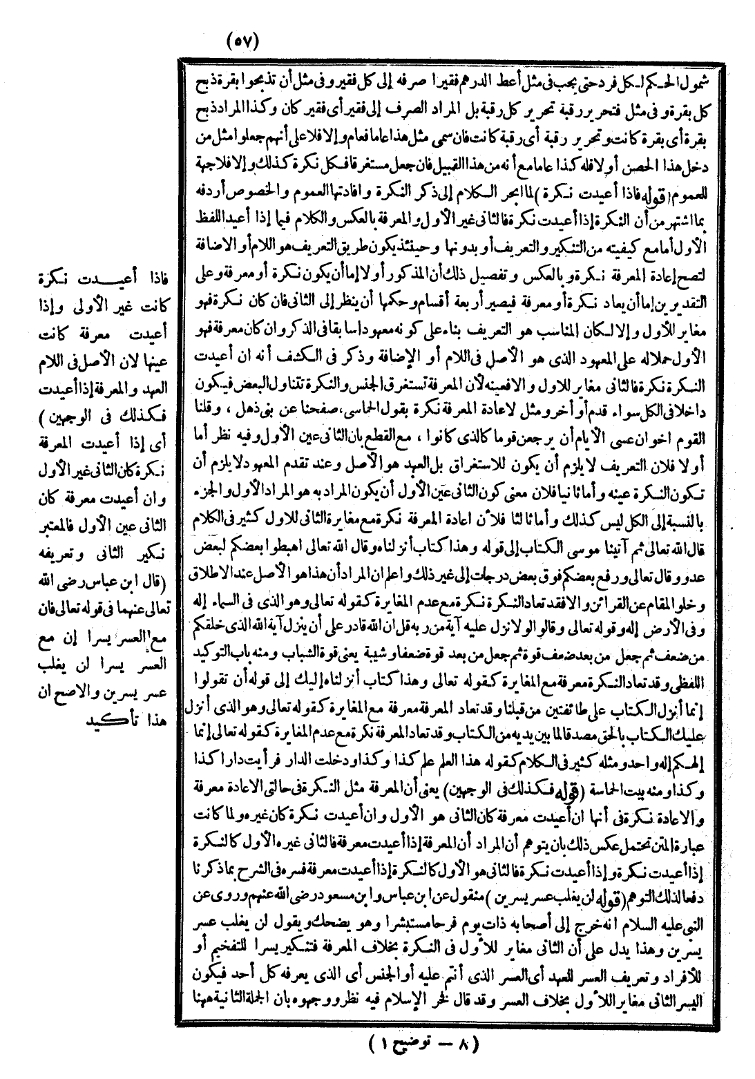 وَاحِدًا) أَيْ: وُضِعَ لِلْكَثِيرِ وَضْعًا وَاحِدًا. (وَالْكَثِيرُ غَيْرُ مَحْصُورٍ فَعَامٌّ إنْ اسْتَغْرَقَ جَمِيعَ مَا يَصْلُحُ لَهُ وَإِلَّا فَجَمْعٌ مُنَكَّرٌ وَنَحْوُهُ) فَالْعَامُّ لَفْظٌ وُضِعَ وَضْعًا وَاحِدًا لِكَثِيرٍ غَيْرِ مَحْصُورٍ، مُسْتَغْرِقٌ جَمِيعَ مَا يَصْلُحُ لَهُ فَقَوْلُهُ وَضْعًا وَاحِدًا يُخْرِجُ الْمُشْتَرَكَ، وَالْكَثِيرُ يُخْرِجُ مَا لَمْ يُوضَعْ لِكَثِيرٍ كَزَيْدٍ وَعَمْرٍو وَغَيْرِ مَحْصُورٍ يُخْرِجُ أَسْمَاءَ الْعَدَدِ، فَإِنَّ الْمِائَةَ مَثَلًا وُضِعَتْ وَضْعًا وَاحِدًا لِلْكَثِيرِ وَهِيَ مُسْتَغْرِقَةٌ جَمِيعَ مَا يَصْلُحُ لَهُ لَكِنَّ الْكَثِيرَ مَحْصُورٌ، وَقَوْلُهُ مُسْتَغْرِقٌ جَمِيعَ مَا يَصْلُحُ