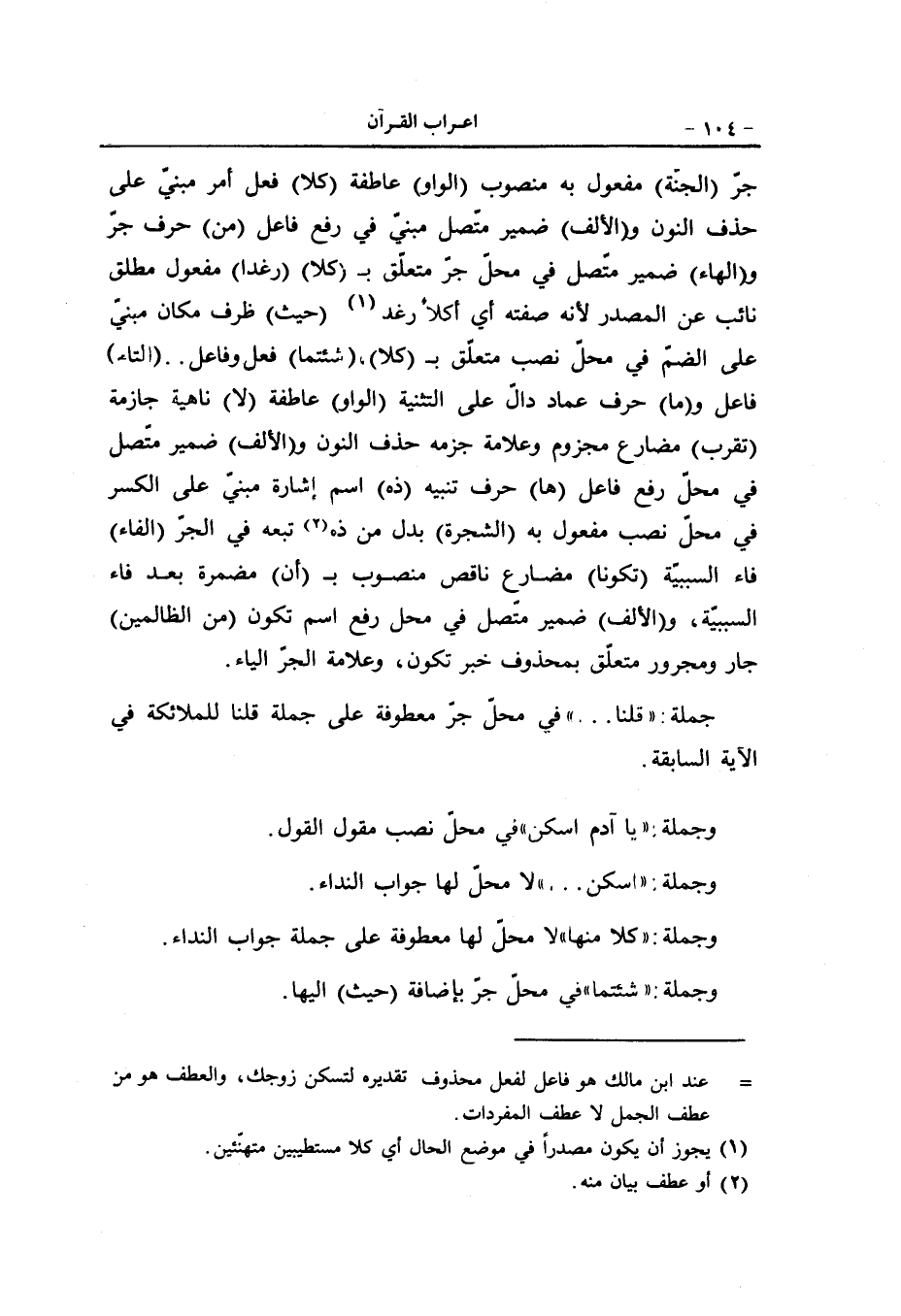 جرّ (الجنّة) مفعول به منصوب (الواو) عاطفة (كلا) فعل أمر مبنيّ على حذف النون و (الألف) ضمير متّصل مبنيّ في رفع فاعل (من) حرف جرّ و (الهاء) ضمير متّصل في محلّ جرّ متعلّق ب (كلا) (رغدا) مفعول مطلق نائب عن المصدر لأنه صفته أي أكلا رغد «1» (حيث) ظرف مكان مبنيّ على الضمّ في محلّ نصب متعلّق ب (كلا) ، (شئتما) فعل وفاعل.. (التاء) فاعل و (ما) حرف عماد دالّ على التثنية (الواو) عاطفة (لا) ناهية جازمة (تقرب) مضارع مجزوم وعلامة جزمه حذف النون و (الألف) ضمير متّصل في محلّ رفع فاعل (ها) حرف تنبيه (ذه) اسم إشارة مبنيّ على الكسر في محلّ نصب مفعول به (الشجرة) بدل من ذه «2» تبعه في الجرّ (الفاء) فاء السببيّة (تكونا) مضارع ناقص منصوب ب (أن) مضمرة بعد فاء السببيّة، و (الألف) ضمير متّصل في محل رفع اسم تكون (من الظالمين) جار ومجرور متعلّق بمحذوف خبر تكون، وعلامة الجرّ الياء.