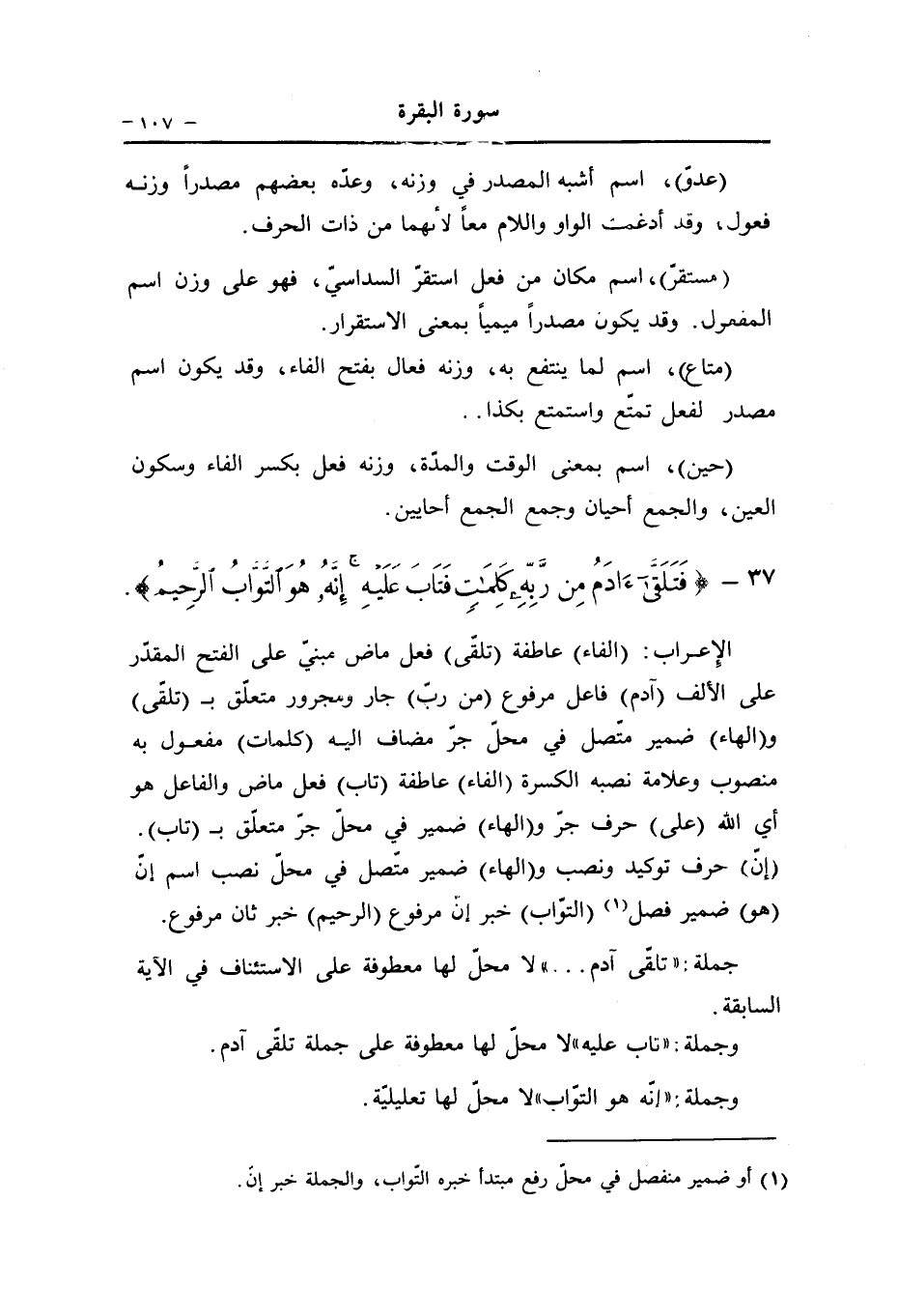 (الفاء) عاطفة (تلقّى) فعل ماض مبنيّ على الفتح المقدّر على الألف (آدم) فاعل مرفوع (من ربّ) جار ومجرور متعلّق ب (تلقّى) و (الهاء) ضمير متّصل في محلّ جرّ مضاف اليه (كلمات) مفعول به منصوب وعلامة نصبه الكسرة (الفاء) عاطفة (تاب) فعل ماض والفاعل هو أي الله (على) حرف جرّ و (الهاء) ضمير في محلّ جرّ متعلّق ب (تاب) .