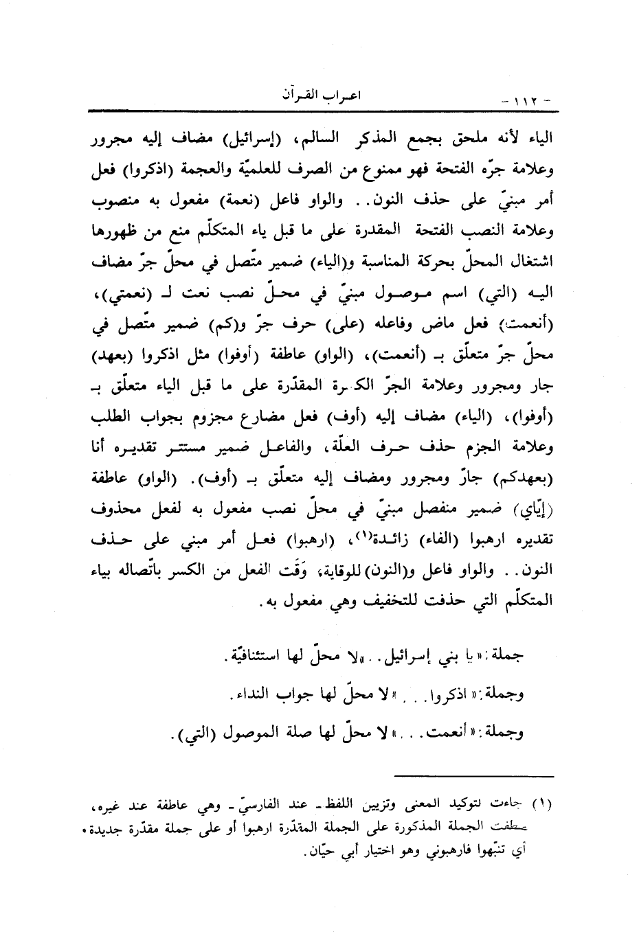 الياء لأنه ملحق بجمع المذكر السالم، (إسرائيل) مضاف إليه مجرور وعلامة جرّه الفتحة فهو ممنوع من الصرف للعلميّة والعجمة (اذكروا) فعل أمر مبنيّ على حذف النون.. والواو فاعل (نعمة) مفعول به منصوب وعلامة النصب الفتحة المقدرة على ما قبل ياء المتكلّم منع من ظهورها اشتغال المحلّ بحركة المناسبة و (الياء) ضمير متّصل في محلّ جرّ مضاف اليه (التي) اسم موصول مبنيّ في محلّ نصب نعت ل (نعمتي) ، (أنعمت) فعل ماض وفاعله (على) حرف جرّ و (كم) ضمير متّصل في محلّ جرّ متعلّق ب (أنعمت) ، (الواو) عاطفة (أوفوا) مثل اذكروا (بعهد) جار ومجرور وعلامة الجرّ الكسرة المقدّرة على ما قبل الياء متعلّق ب (أوفوا) ، (الياء) مضاف إليه (أوف) فعل مضارع مجزوم بجواب الطلب وعلامة الجزم حذف حرف العلّة، والفاعل ضمير مستتر تقديره أنا (بعهدكم) جارّ ومجرور ومضاف إليه متعلّق ب (أوف) . (الواو) عاطفة (إيّاي) ضمير منفصل مبنيّ في محلّ نصب مفعول به لفعل محذوف تقديره ارهبوا (الفاء) زائدة «1» ، (ارهبوا) فعل أمر مبني على حذف النون.. والواو فاعل و (النون) للوقاية، وقت الفعل من الكسر باتّصاله بياء المتكلّم التي حذفت للتخفيف وهي مفعول به.