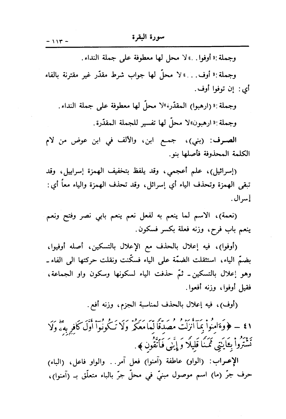 (أوفوا) ، فيه إعلال بالحذف مع الإعلال بالتسكين، أصله أوفيوا، بضمّ الياء، استثقلت الضمّة على الياء فسكّنت ونقلت حركتها الى الفاء- وهو إعلال بالتسكين- ثمّ حذفت الياء لسكونها وسكون واو الجماعة، فقيل أوفوا، وزنه أفعوا.