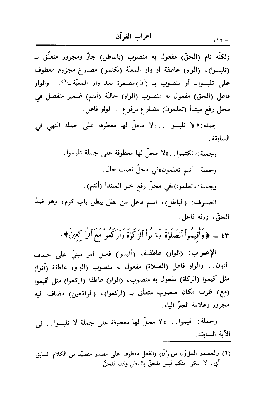 ولكنّه تام (الحقّ) مفعول به منصوب (بالباطل) جارّ ومجرور متعلّق ب (تلبسوا) ، (الواو) عاطفة أو واو المعيّة (تكتموا) مضارع مجزوم معطوف على تلبسوا- أو منصوب ب (أن) مضمرة بعد واو المعيّة- «1» .. والواو فاعل (الحق) مفعول به منصوب (الواو) حاليّة (أنتم) ضمير منفصل في محل رفع مبتدأ (تعلمون) مضارع مرفوع.. الواو فاعل.