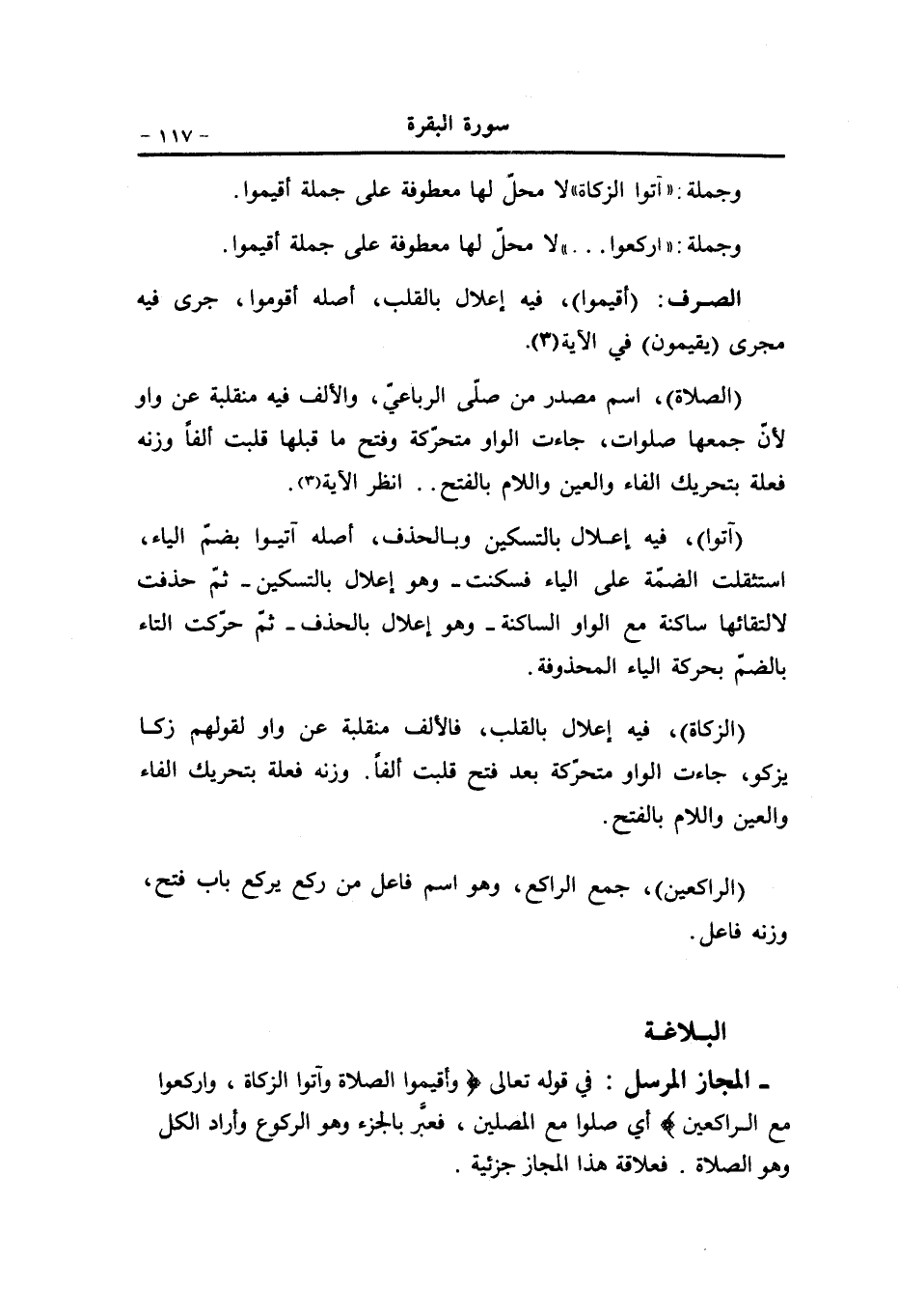 (الزكاة) ، فيه إعلال بالقلب، فالألف منقلبة عن واو لقولهم زكا يزكو، جاءت الواو متحرّكة بعد فتح قلبت ألفا. وزنه فعلة بتحريك الفاء والعين واللام بالفتح.
