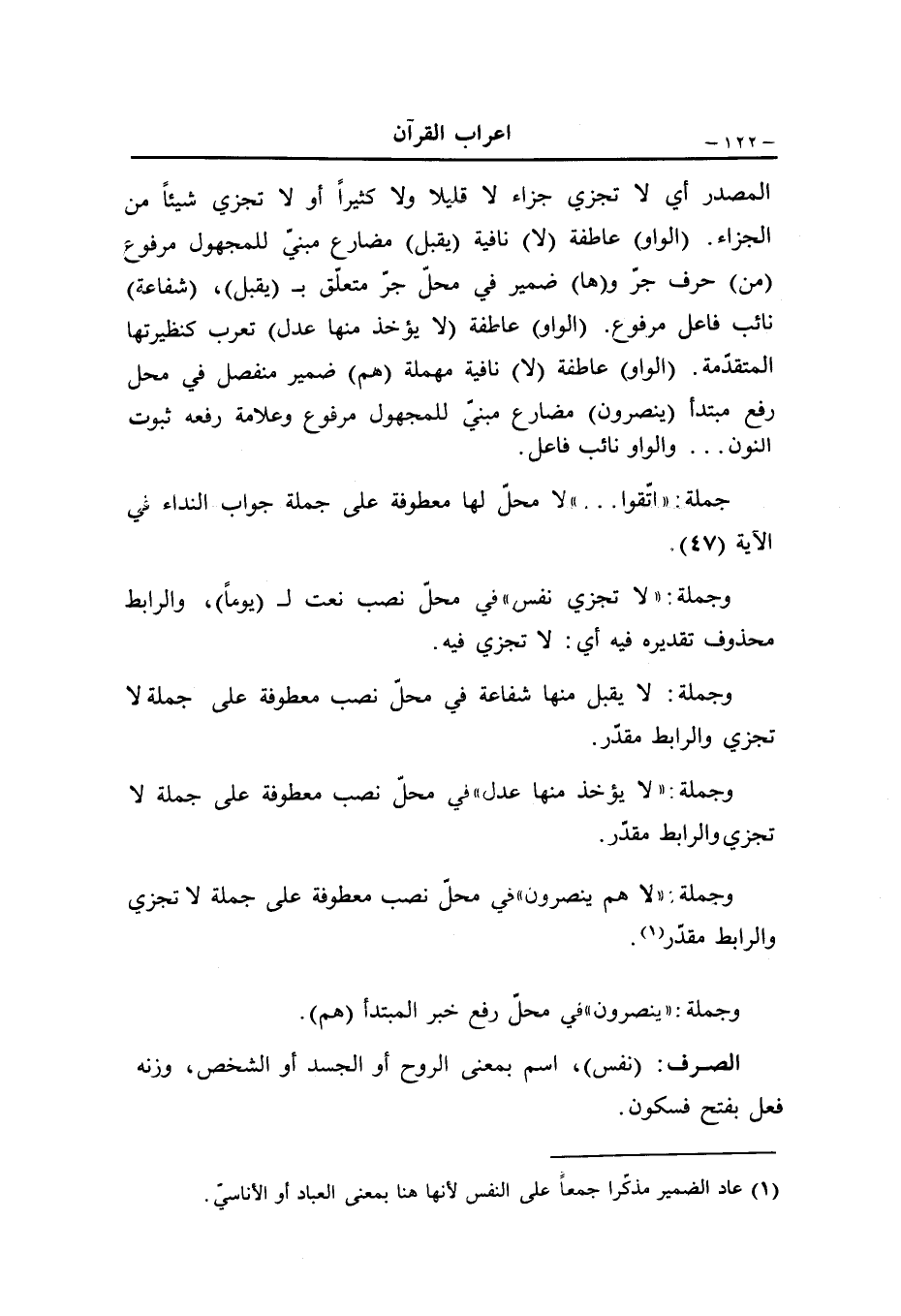 المصدر أي لا تجزي جزاء لا قليلا ولا كثيرا أو لا تجزي شيئا من الجزاء. (الواو) عاطفة (لا) نافية (يقبل) مضارع مبنيّ للمجهول مرفوع (من) حرف جرّ و (ها) ضمير في محلّ جرّ متعلّق ب (يقبل) ، (شفاعة) نائب فاعل مرفوع. (الواو) عاطفة (لا يؤخذ منها عدل) تعرب كنظيرتها المتقدّمة. (الواو) عاطفة (لا) نافية مهملة (هم) ضمير منفصل في محل رفع مبتدأ (ينصرون) مضارع مبنيّ للمجهول مرفوع وعلامة رفعه ثبوت النون ... والواو نائب فاعل.