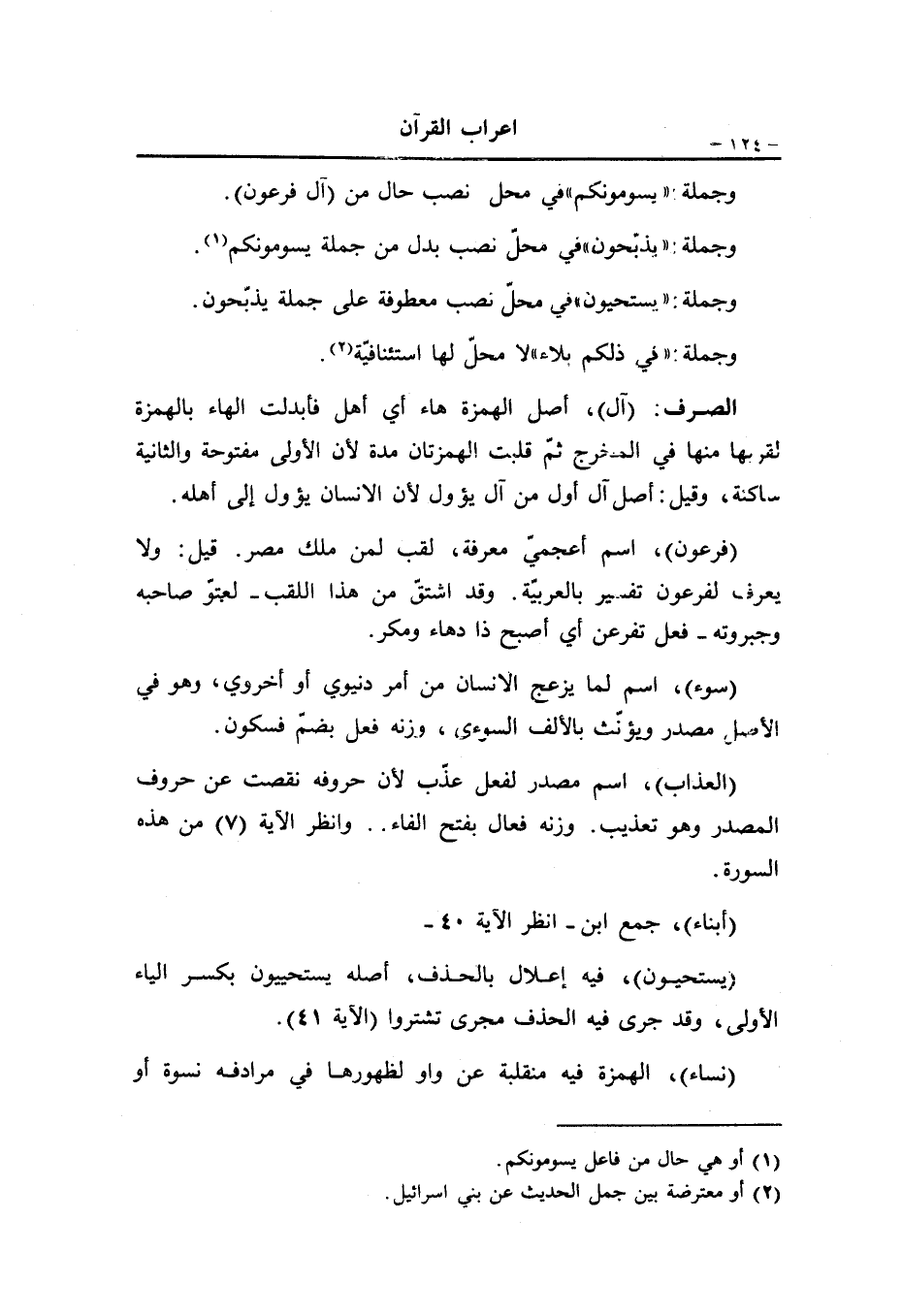 (أبناء) ، جمع ابن- انظر الآية 40- (يستحيون) ، فيه إعلال بالحذف، أصله يستحييون بكسر الياء الأولى، وقد جرى فيه الحذف مجرى تشتروا (الآية 41) .