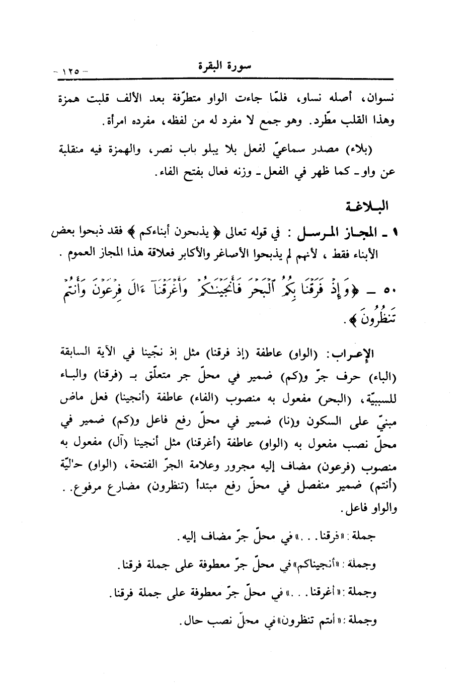 (الواو) عاطفة (إذ فرقنا) مثل إذ نجّينا في الآية السابقة (الباء) حرف جرّ و (كم) ضمير في محلّ جر متعلّق ب (فرقنا) والباء للسببيّة، (البحر) مفعول به منصوب (الفاء) عاطفة (أنجينا) فعل ماض مبنيّ على السكون و (نا) ضمير في محلّ رفع فاعل و (كم) ضمير في محلّ نصب مفعول به (الواو) عاطفة (أغرقنا) مثل أنجينا (آل) مفعول به منصوب (فرعون) مضاف إليه مجرور وعلامة الجرّ الفتحة، (الواو) حاليّة (أنتم) ضمير منفصل في محلّ رفع مبتدأ (تنظرون) مضارع مرفوع..