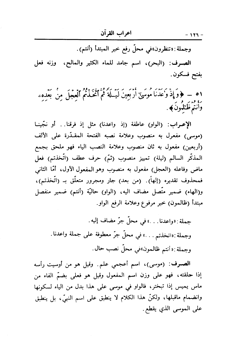 (الواو) عاطفة (إذ واعدنا) مثل إذ فرقنا ... أو نجّينا (موسى) مفعول به منصوب وعلامة نصبه الفتحة المقدّرة على الألف (أربعين) مفعول به ثان منصوب وعلامة النصب الياء فهو ملحق بجمع المذكّر السالم (ليلة) تمييز منصوب (ثمّ) حرف عطف (اتّخذتم) فعل ماض وفاعله (العجل) مفعول به منصوب وهو المفعول الأول، أمّا الثاني فمحذوف تقديره (إلها) . (من بعد) جار ومجرور متعلّق ب (اتّخذتم) ، و (الهاء) ضمير متّصل مضاف اليه، (الواو) حاليّة (أنتم) ضمير منفصل مبتدأ (ظالمون) خبر مرفوع وعلامة الرفع الواو.