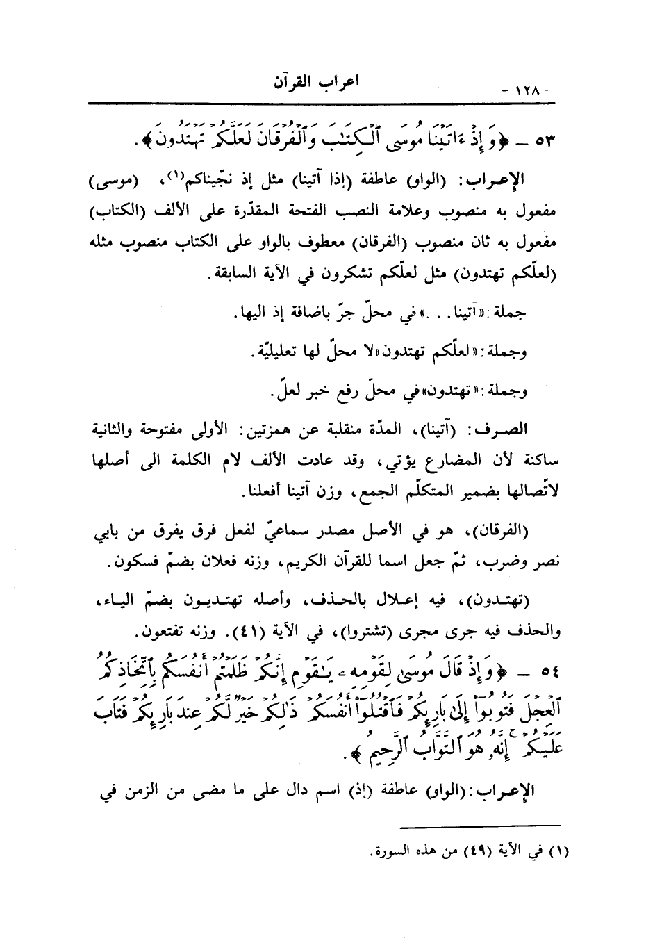 (الواو) عاطفة (إذا آتينا) مثل إذ نجّيناكم «1» ، (موسى) مفعول به منصوب وعلامة النصب الفتحة المقدّرة على الألف (الكتاب) مفعول به ثان منصوب (الفرقان) معطوف بالواو على الكتاب منصوب مثله (لعلّكم تهتدون) مثل لعلّكم تشكرون في الآية السابقة.