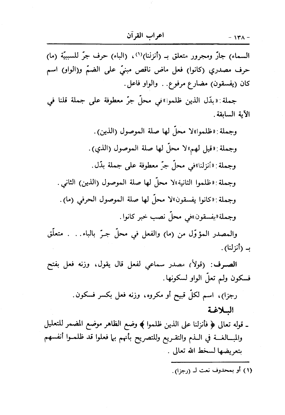 السماء) جارّ ومجرور متعلق ب (أنزلنا) «1» ، (الباء) حرف جرّ للسببيّة (ما) حرف مصدري (كانوا) فعل ماض ناقص مبنيّ على الضمّ و (الواو) اسم كان (يفسقون) مضارع مرفوع.. والواو فاعل.