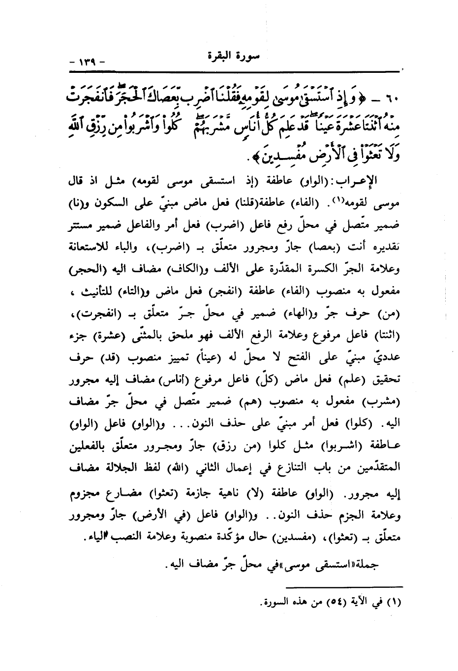 (الواو) عاطفة (إذ استسقى موسى لقومه) مثل إذ قال موسى لقومه «1» . (الفاء) عاطفة (قلنا) فعل ماض مبنيّ على السكون و (نا) ضمير متّصل في محلّ رفع فاعل (اضرب) فعل أمر والفاعل ضمير مستتر تقديره أنت (بعصا) جارّ ومجرور متعلّق ب (اضرب) ، والباء للاستعانة وعلامة الجرّ الكسرة المقدّرة على الألف و (الكاف) مضاف اليه (الحجر) مفعول به منصوب (الفاء) عاطفة (انفجر) فعل ماض و (التاء) للتأنيث، (من) حرف جرّ و (الهاء) ضمير في محلّ جرّ متعلّق ب (انفجرت) ، (اثنتا) فاعل مرفوع وعلامة الرفع الألف فهو ملحق بالمثنّى (عشرة) جزء عدديّ مبنيّ على الفتح لا محلّ له (عينا) تمييز منصوب (قد) حرف تحقيق (علم) فعل ماض (كلّ) فاعل مرفوع (أناس) مضاف إليه مجرور (مشرب) مفعول به منصوب (هم) ضمير متّصل في محلّ جرّ مضاف اليه. (كلوا) فعل أمر مبنيّ على حذف النون ... و (الواو) فاعل (الواو) عاطفة (اشربوا) مثل كلوا (من رزق) جارّ ومجرور متعلّق بالفعلين المتقدّمين من باب التنازع في إعمال الثاني (الله) لفظ الجلالة مضاف إليه مجرور. (الواو) عاطفة (لا) ناهية جازمة (تعثوا) مضارع مجزوم وعلامة الجزم حذف النون.. و (الواو) فاعل (في الأرض) جارّ ومجرور متعلّق ب (تعثوا) ، (مفسدين) حال مؤكّدة منصوبة وعلامة النصب الياء.