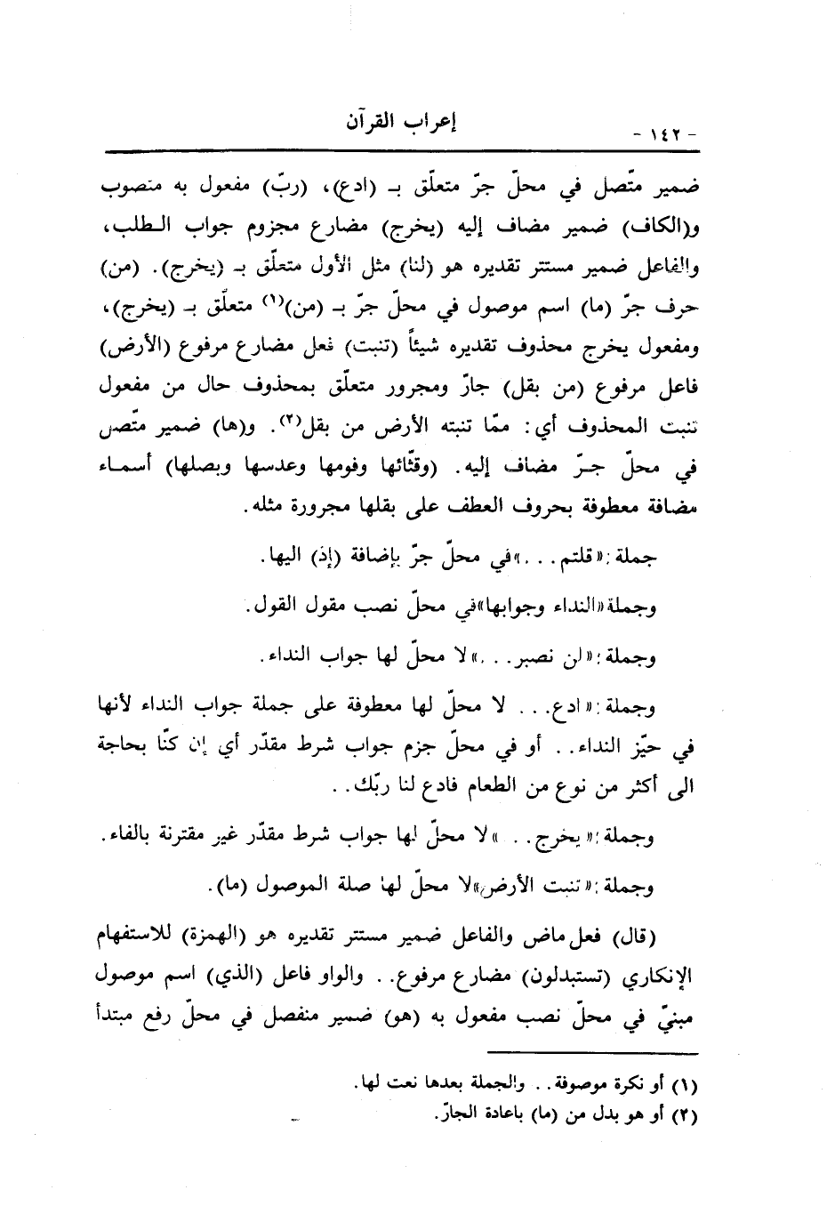 ضمير متّصل في محلّ جرّ متعلّق ب (ادع) ، (ربّ) مفعول به منصوب و (الكاف) ضمير مضاف إليه (يخرج) مضارع مجزوم جواب الطلب، والفاعل ضمير مستتر تقديره هو (لنا) مثل الأول متعلّق ب (يخرج) . (من) حرف جرّ (ما) اسم موصول في محلّ جرّ ب (من) «1» متعلّق ب (يخرج) ، ومفعول يخرج محذوف تقديره شيئا (تنبت) فعل مضارع مرفوع (الأرض) فاعل مرفوع (من بقل) جارّ ومجرور متعلّق بمحذوف حال من مفعول تنبت المحذوف أي: ممّا تنبته الأرض من بقل «2» . و (ها) ضمير متّصل في محلّ جرّ مضاف إليه. (وقثّائها وفومها وعدسها وبصلها) أسماء مضافة معطوفة بحروف العطف على بقلها مجرورة مثله.
