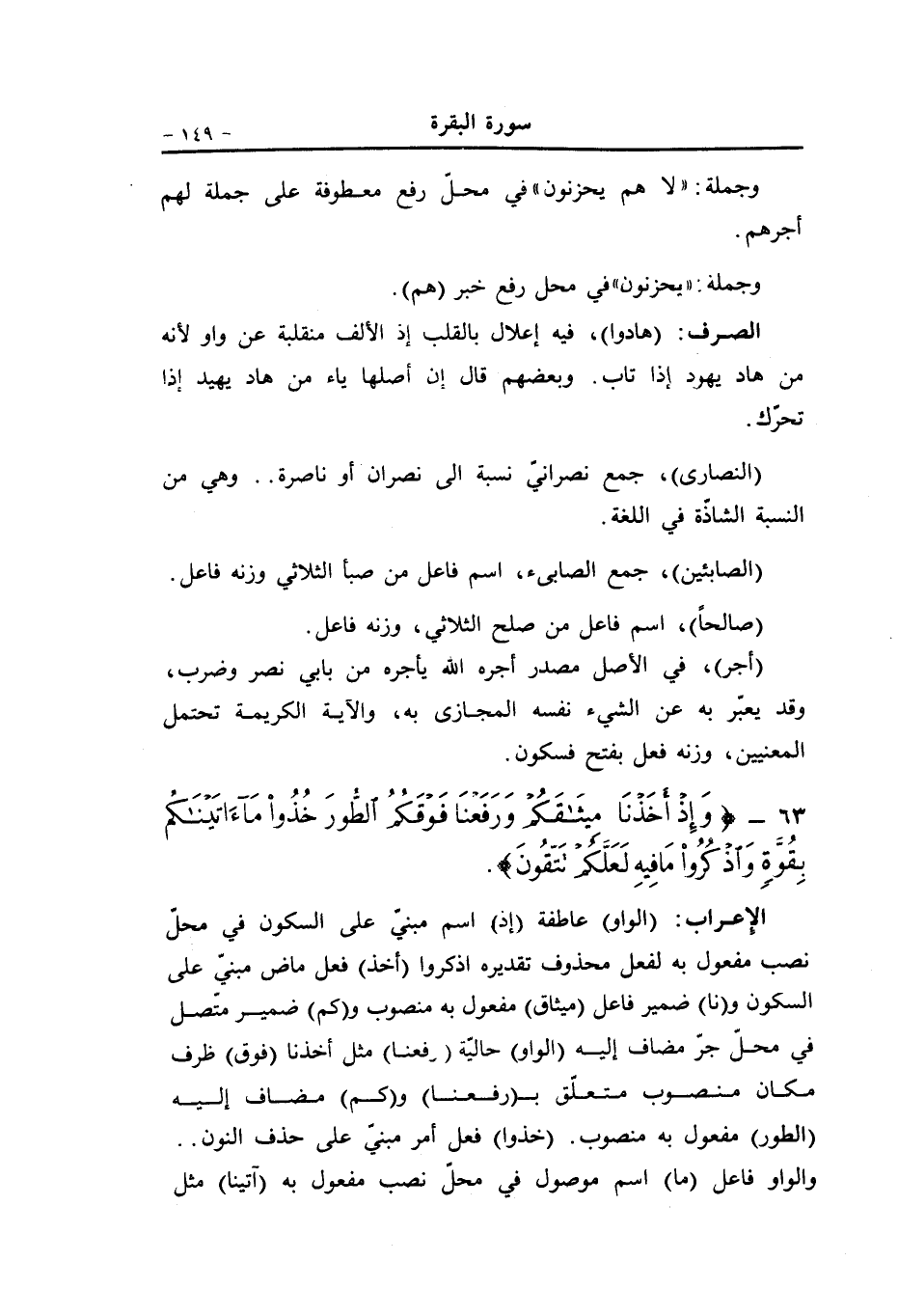 (الواو) عاطفة (إذ) اسم مبنيّ على السكون في محلّ نصب مفعول به لفعل محذوف تقديره اذكروا (أخذ) فعل ماض مبنيّ على السكون و (نا) ضمير فاعل (ميثاق) مفعول به منصوب و (كم) ضمير متّصل في محلّ جرّ مضاف إليه (الواو) حاليّة (رفعنا) مثل أخذنا (فوق) ظرف مكان منصوب متعلّق ب (رفعنا) و (كم) مضاف إليه (الطور) مفعول به منصوب. (خذوا) فعل أمر مبنيّ على حذف النون..