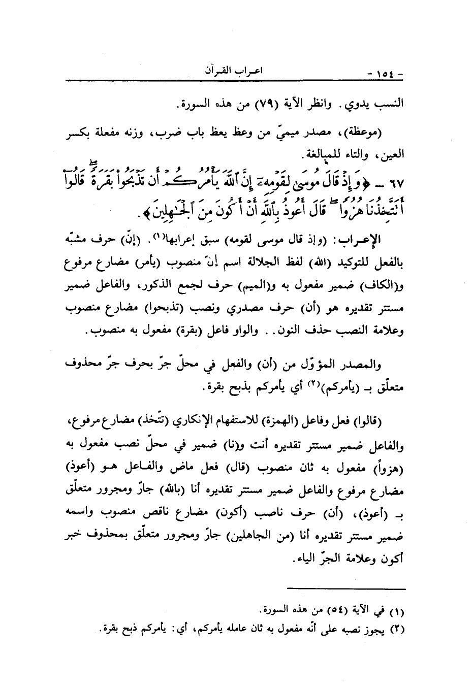 (وإذ قال موسى لقومه) سبق إعرابها «1» . (إنّ) حرف مشبّه بالفعل للتوكيد (الله) لفظ الجلالة اسم إنّ منصوب (يأمر) مضارع مرفوع و (الكاف) ضمير مفعول به و (الميم) حرف لجمع الذكور، والفاعل ضمير مستتر تقديره هو (أن) حرف مصدري ونصب (تذبحوا) مضارع منصوب وعلامة النصب حذف النون.. والواو فاعل (بقرة) مفعول به منصوب.