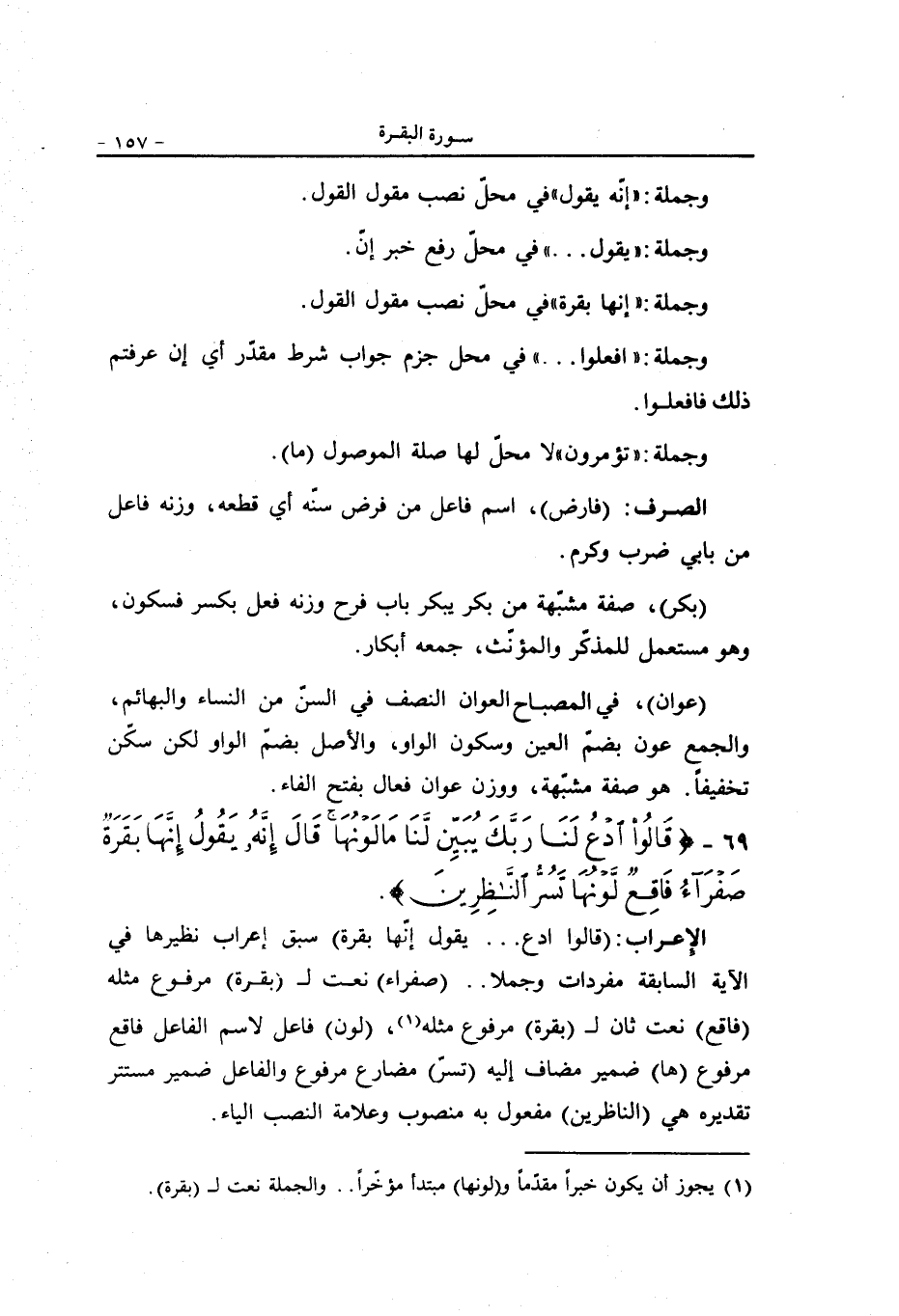 (قالوا ادع ... يقول إنّها بقرة) سبق إعراب نظيرها في الآية السابقة مفردات وجملا.. (صفراء) نعت ل (بقرة) مرفوع مثله (فاقع) نعت ثان ل (بقرة) مرفوع مثله «1» ، (لون) فاعل لاسم الفاعل فاقع مرفوع (ها) ضمير مضاف إليه (تسرّ) مضارع مرفوع والفاعل ضمير مستتر تقديره هي (الناظرين) مفعول به منصوب وعلامة النصب الياء.