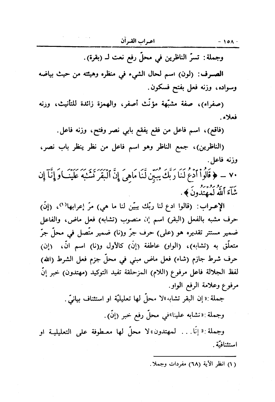 (قالوا ادع لنا ربّك يبيّن لنا ما هي) مرّ إعرابها «1» ، (إنّ) حرف مشبه بالفعل (البقر) اسم إن منصوب (تشابه) فعل ماض، والفاعل ضمير مستتر تقديره هو (على) حرف جرّ و (نا) ضمير متّصل في محلّ جرّ متعلّق به (تشابه) ، (الواو) عاطفة (إنّ) كالأول و (نا) اسم انّ، (إن) حرف شرط جازم (شاء) فعل ماض مبني في محلّ جزم فعل الشرط (الله) لفظ الجلالة فاعل مرفوع (اللام) المزحلقة تفيد التوكيد (مهتدون) خبر إنّ مرفوع وعلامة الرفع الواو.