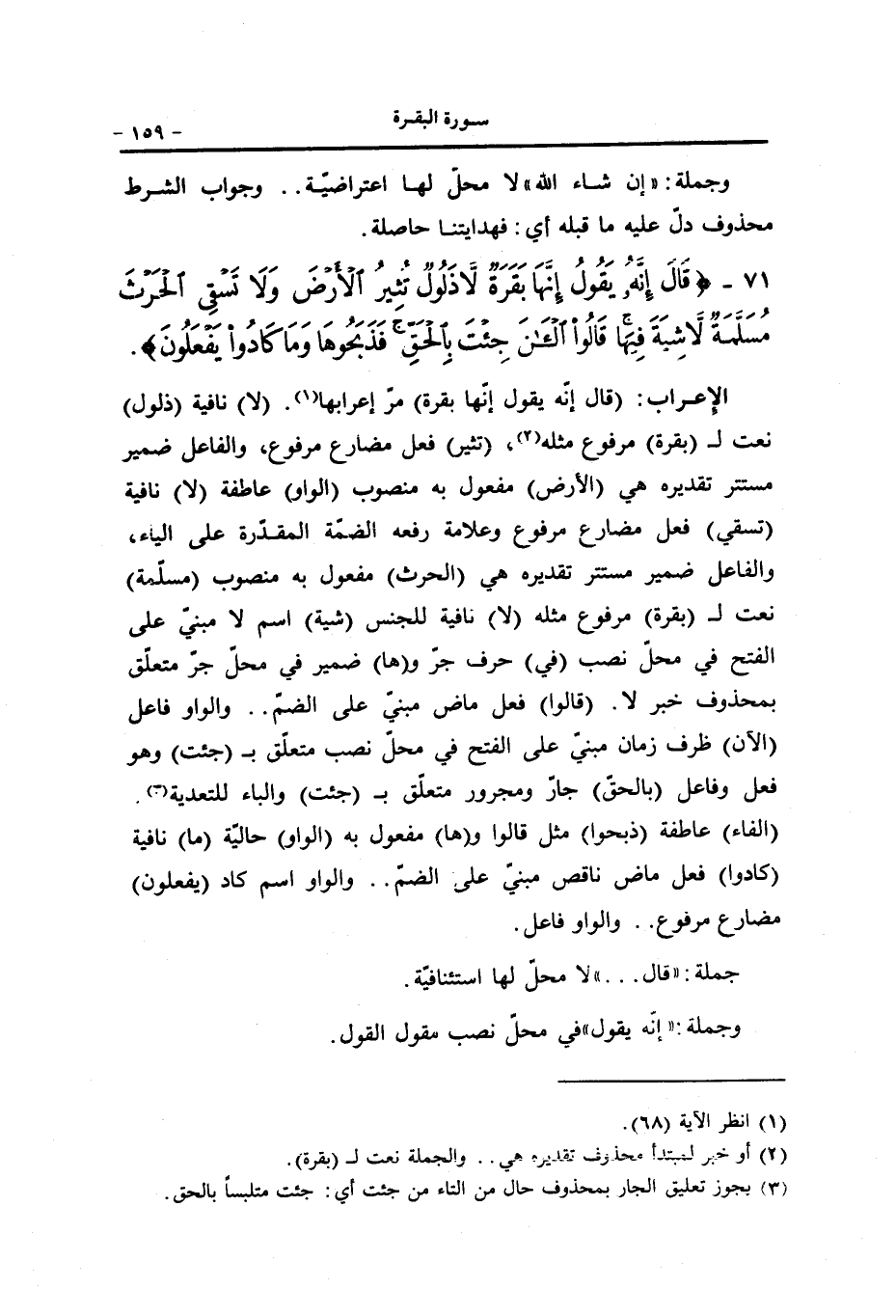 (قال إنّه يقول إنّها بقرة) مرّ إعرابها «1» . (لا) نافية (ذلول) نعت ل (بقرة) مرفوع مثله «2» ، (تثير) فعل مضارع مرفوع، والفاعل ضمير مستتر تقديره هي (الأرض) مفعول به منصوب (الواو) عاطفة (لا) نافية (تسقي) فعل مضارع مرفوع وعلامة رفعه الضمّة المقدّرة على الياء، والفاعل ضمير مستتر تقديره هي (الحرث) مفعول به منصوب (مسلّمة) نعت ل (بقرة) مرفوع مثله (لا) نافية للجنس (شية) اسم لا مبنيّ على الفتح في محلّ نصب (في) حرف جرّ و (ها) ضمير في محلّ جرّ متعلّق بمحذوف خبر لا. (قالوا) فعل ماض مبنيّ على الضمّ.. والواو فاعل (الآن) ظرف زمان مبنيّ على الفتح في محلّ نصب متعلّق ب (جئت) وهو فعل وفاعل (بالحقّ) جارّ ومجرور متعلّق ب (جئت) والباء للتعدية «3» .