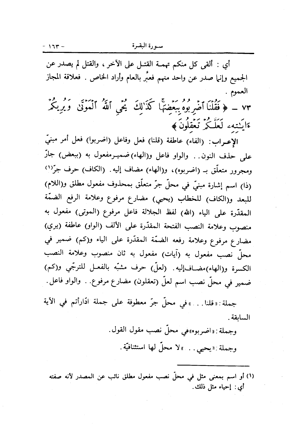 (الفاء) عاطفة (قلنا) فعل وفاعل (اضربوا) فعل أمر مبنيّ على حذف النون.. والواو فاعل و (الهاء) ضمير مفعول به (ببعض) جارّ ومجرور متعلّق ب (اضربوه) ، و (الهاء) مضاف إليه. (الكاف) حرف جرّ «1» (ذا) اسم إشارة مبنيّ في محلّ جرّ متعلّق بمحذوف مفعول مطلق و (اللام) للبعد و (الكاف) للخطاب (يحيي) مضارع مرفوع وعلامة الرفع الضمّة المقدّرة على الياء (الله) لفظ الجلالة فاعل مرفوع (الموتى) مفعول به منصوب وعلامة النصب الفتحة المقدّرة على الألف (الواو) عاطفة (يري) مضارع مرفوع وعلامة رفعه الضمّة المقدّرة على الياء و (كم) ضمير في محلّ نصب مفعول به (آيات) مفعول به ثان منصوب وعلامة النصب الكسرة و (الهاء) مضاف إليه. (لعلّ) حرف مشبّه بالفعل للترجّي و (كم) ضمير في محلّ نصب اسم لعلّ (تعقلون) مضارع مرفوع.. والواو فاعل.