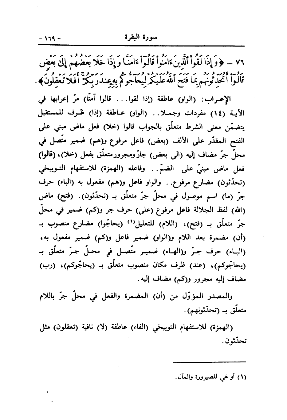(الواو) عاطفة (إذا لقوا ... قالوا آمنّا) مرّ إعرابها في الآية (14) مفردات وجملا.. (الواو) عاطفة (إذا) ظرف للمستقبل يتضمّن معنى الشرط متعلّق بالجواب قالوا (خلا) فعل ماض مبني على الفتح المقدّر على الألف (بعض) فاعل مرفوع و (هم) ضمير متّصل في محلّ جرّ مضاف إليه (الى بعض) جارّ ومجرور متعلّق بفعل (خلا) ، (قالوا) فعل ماض مبنيّ على الضمّ.. وفاعله (الهمزة) للاستفهام التوبيخي (تحدّثون) مضارع مرفوع.. والواو فاعل و (هم) مفعول به (الباء) حرف جرّ (ما) اسم موصول في محلّ جرّ متعلّق ب (تحدّثون) . (فتح) ماض (الله) لفظ الجلالة فاعل مرفوع (على) حرف جر و (كم) ضمير في محلّ جرّ متعلّق ب (فتح) ، (اللام) للتعليل «1» (يحاجّوا) مضارع منصوب ب (أن) مضمرة بعد اللام و (الواو) ضمير فاعل و (كم) ضمير مفعول به، (الباء) حرف جرّ و (الهاء) ضمير متّصل في محلّ جرّ متعلّق ب (يحاجّوكم) ، (عند) ظرف مكان منصوب متعلّق ب (يحاجّوكم) ، (رب) مضاف إليه مجرور و (كم) مضاف إليه.