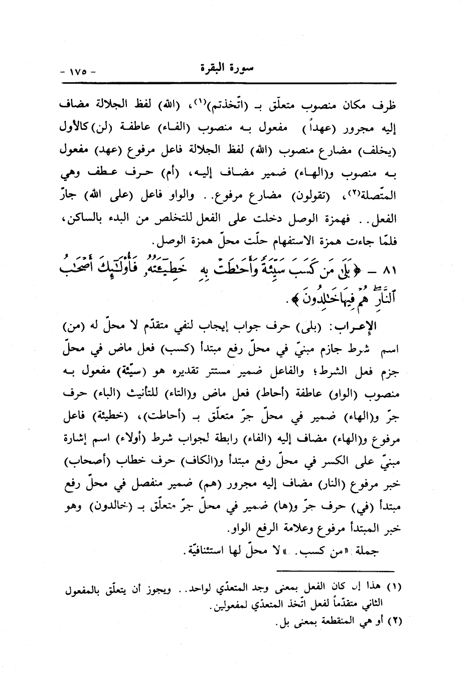 (بلى) حرف جواب إيجاب لنفي متقدّم لا محلّ له (من) اسم شرط جازم مبنيّ في محلّ رفع مبتدأ (كسب) فعل ماض في محلّ جزم فعل الشرط، والفاعل ضمير مستتر تقديره هو (سيّئة) مفعول به منصوب (الواو) عاطفة (أحاط) فعل ماض و (التاء) للتأنيث (الباء) حرف جرّ و (الهاء) ضمير في محلّ جرّ متعلّق ب (أحاطت) ، (خطيئة) فاعل مرفوع و (الهاء) مضاف إليه (الفاء) رابطة لجواب شرط (أولاء) اسم إشارة مبنيّ على الكسر في محلّ رفع مبتدأ و (الكاف) حرف خطاب (أصحاب) خبر مرفوع (النار) مضاف إليه مجرور (هم) ضمير منفصل في محلّ رفع مبتدأ (في) حرف جرّ و (ها) ضمير في محلّ جرّ متعلّق ب (خالدون) وهو خبر المبتدأ مرفوع وعلامة الرفع الواو.