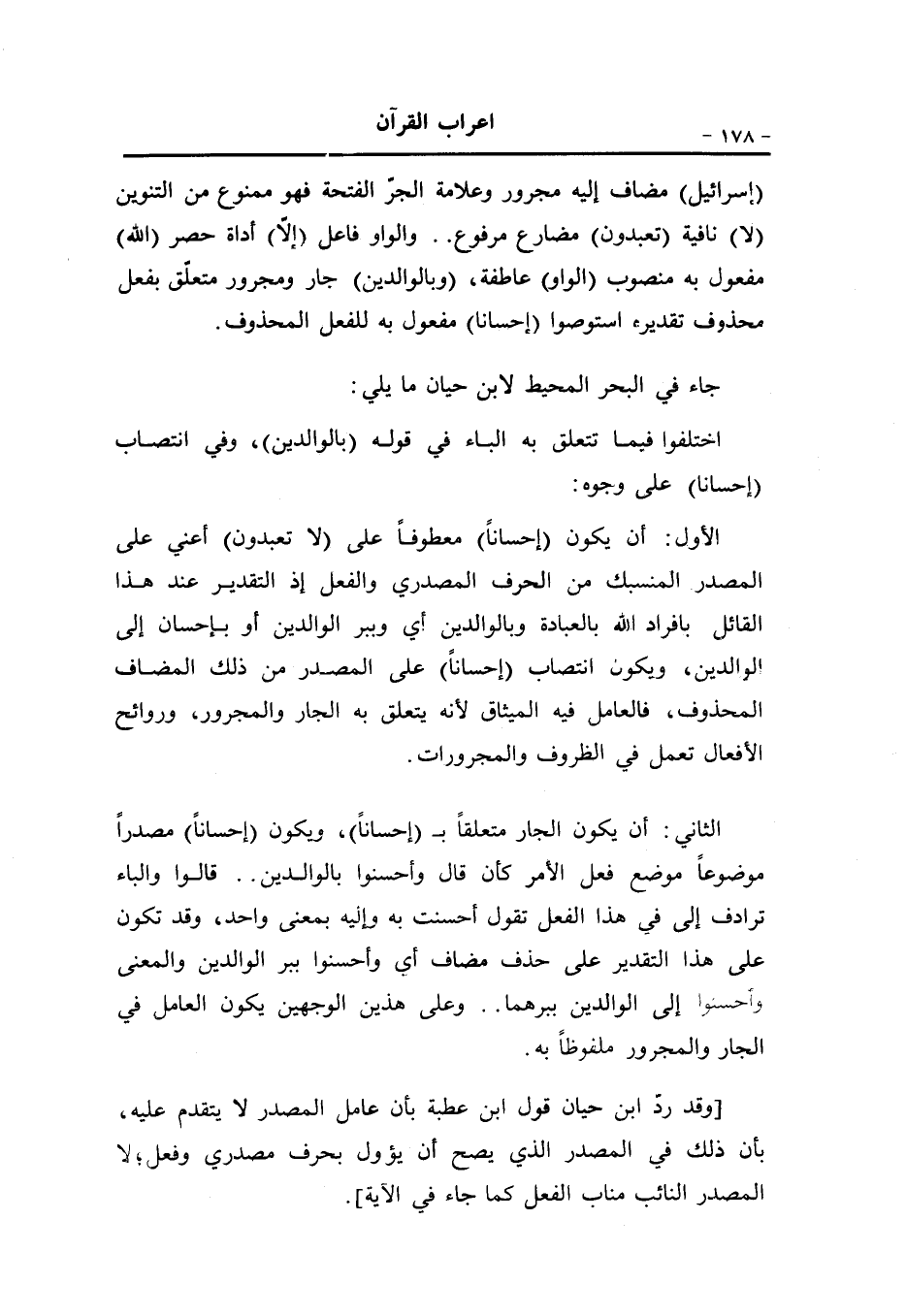 الأول: أن يكون (إحسانا) معطوفا على (لا تعبدون) أعني على المصدر المنسبك من الحرف المصدري والفعل إذ التقدير عند هذا القائل بافراد الله بالعبادة وبالوالدين أي وببر الوالدين أو بإحسان إلى الوالدين، ويكون انتصاب (إحسانا) على المصدر من ذلك المضاف المحذوف، فالعامل فيه الميثاق لأنه يتعلق به الجار والمجرور، وروائح الأفعال تعمل في الظروف والمجرورات.