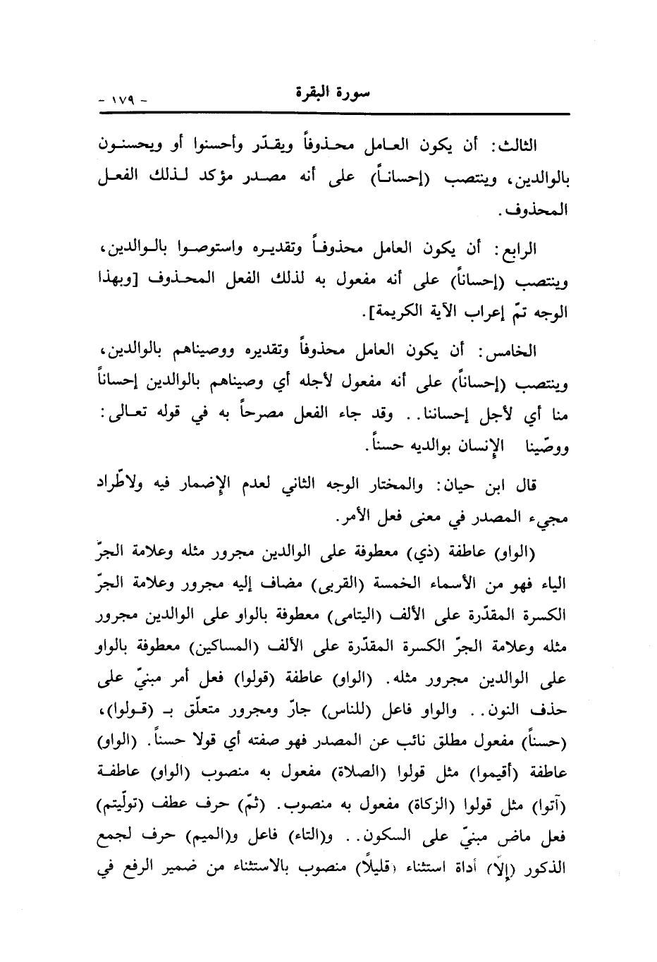 الثالث: أن يكون العامل محذوفا ويقدّر وأحسنوا أو ويحسنون بالوالدين، وينتصب (إحسانا) على أنه مصدر مؤكد لذلك الفعل المحذوف.