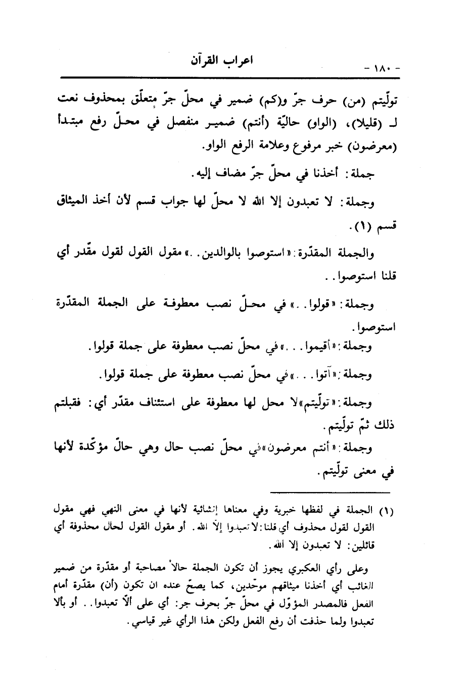 وعلى رأي العكبري يجوز أن تكون الجملة حالا مصاحبة أو مقدّرة من ضمير الغائب أي أخذنا ميثاقهم موحّدين، كما يصحّ عنده ان تكون (أن) مقدّرة أمام الفعل فالمصدر المؤوّل في محلّ جرّ بحرف جر: أي على ألّا تعبدوا.. أو بألا تعبدوا ولما حذفت أن رفع الفعل ولكن هذا الرأي غير قياسي. [.....]