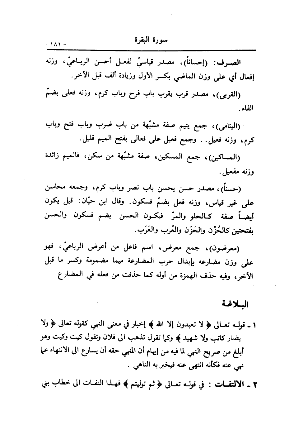 1- قوله تعالى لا تَعْبُدُونَ إِلَّا اللَّهَ إخبار في معنى النهي كقوله تعالى وَلا يُضَارَّ كاتِبٌ وَلا شَهِيدٌ وكما تقول تذهب الى فلان وتقول كيت وكيت وهو أبلغ من صريح النهي لما فيه من إيهام أن المنهي حقه أن يسارع الى الانتهاء عما نهي عنه فكأنه انتهى عنه فيخبر به الناهي.