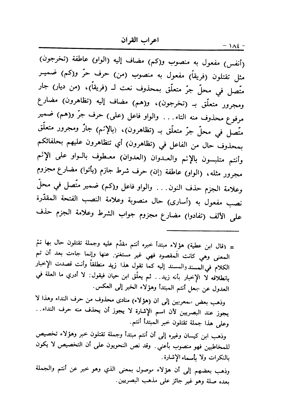 (أنفس) مفعول به منصوب و (كم) مضاف إليه (الواو) عاطفة (تخرجون) مثل تقتلون (فريقا) مفعول به منصوب (من) حرف جرّ و (كم) ضمير متّصل في محلّ جرّ متعلّق بمحذوف نعت ل (فريقا) ، (من ديار) جار ومجرور متعلّق ب (تخرجون) ، و (هم) مضاف إليه (تظاهرون) مضارع مرفوع محذوف منه التاء ... والواو فاعل (على) حرف جرّ و (هم) ضمير متّصل في محلّ جرّ متعلّق ب (تظاهرون) ، (بالإثم) جار ومجرور متعلّق بمحذوف حال من الفاعل في (تظاهرون) أي تتظاهرون عليهم بحلفائكم وأنتم متلبسون بالإثم والعدوان (العدوان) معطوف بالواو على الإثم مجرور مثله، (الواو) عاطفة (إن) حرف شرط جازم (يأتوا) مضارع مجزوم وعلامة الجزم حذف النون ... والواو فاعل و (كم) ضمير متّصل في محلّ نصب مفعول به (أسارى) حال منصوبة وعلامة النصب الفتحة المقدّرة على الألف (تفادوا) مضارع مجزوم جواب الشرط وعلامة الجزم حذف