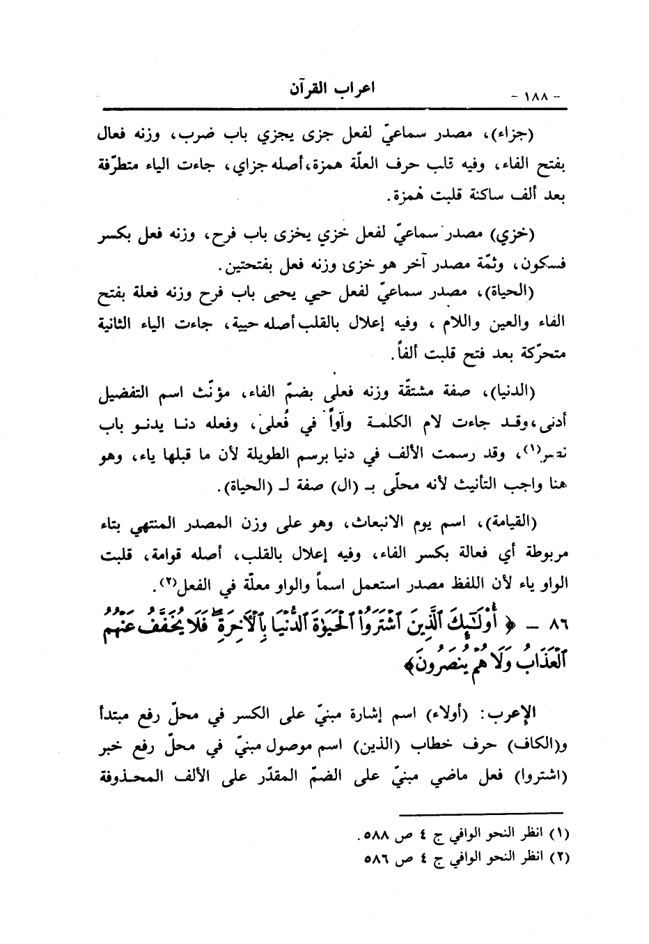 (الدنيا) ، صفة مشتقّة وزنه فعلى بضمّ الفاء، مؤنّث اسم التفضيل أدنى، وقد جاءت لام الكلمة واوا في فعلى، وفعله دنا يدنو باب نصر «1» ، وقد رسمت الألف في دنيا برسم الطويلة لأن ما قبلها ياء، وهو هنا واجب التأنيث لأنه محلّى ب (ال) صفة ل (الحياة) .