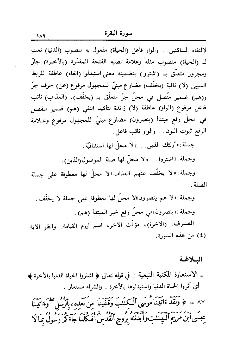 لالتقاء الساكنين.. والواو فاعل (الحياة) مفعول به منصوب (الدنيا) نعت ل (الحياة) منصوب مثله وعلامة نصبه الفتحة المقدّرة (بالآخرة) جارّ ومجرور متعلّق ب (اشتروا) بتضمينه معنى استبدلوا (الفاء) عاطفة للربط السببي (لا) نافية (يخفّف) مضارع مبنيّ للمجهول مرفوع (عن) حرف جرّ و (هم) ضمير متّصل في محلّ جرّ متعلّق ب (يخفّف) ، (العذاب) نائب فاعل مرفوع (الواو) عاطفة (لا) زائدة لتأكيد النفي (هم) ضمير منفصل في محلّ رفع مبتدأ (ينصرون) مضارع مبنيّ للمجهول مرفوع وعلامة الرفع ثبوت النون.. والواو نائب فاعل.