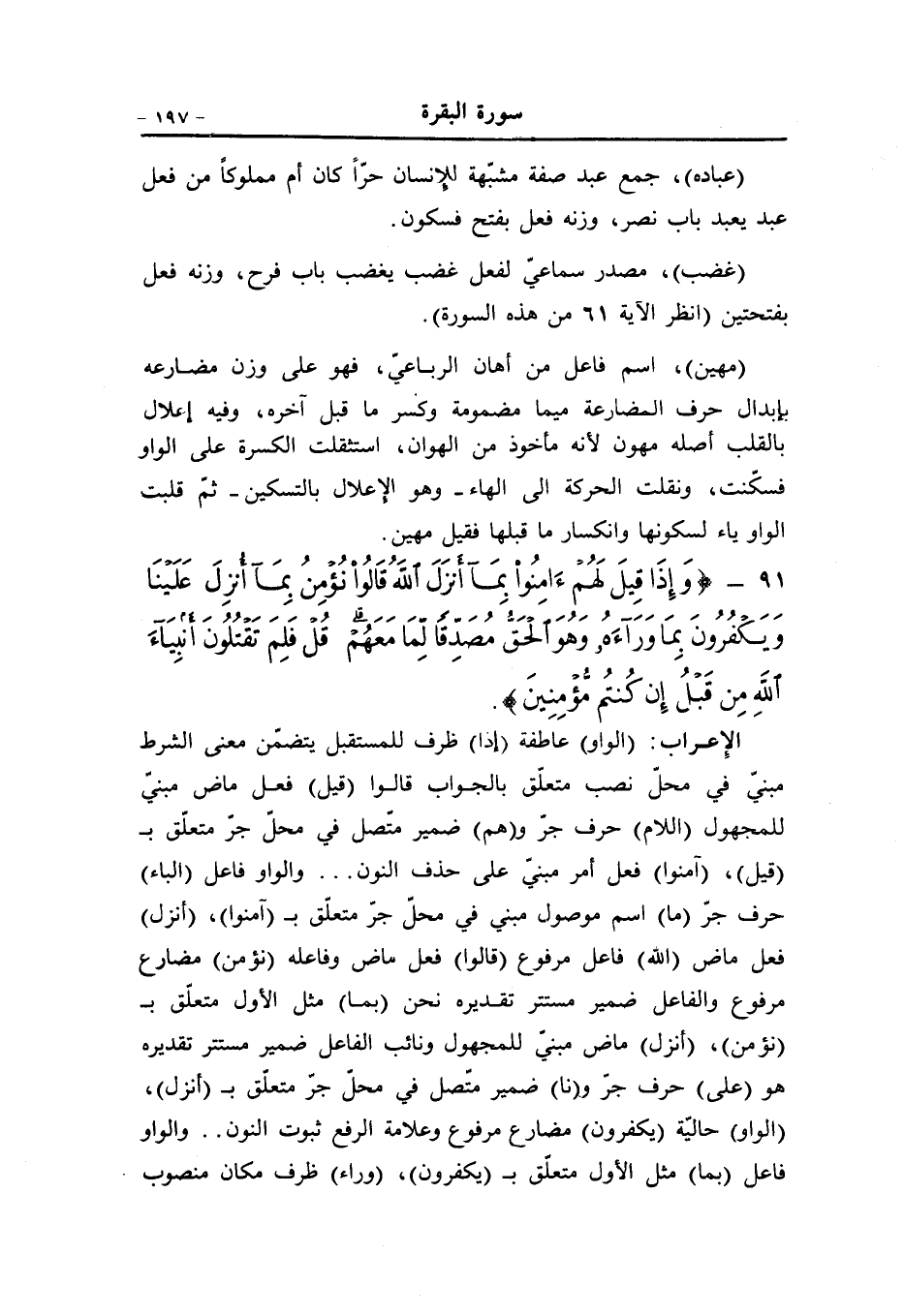 (الواو) عاطفة (إذا) ظرف للمستقبل يتضمّن معنى الشرط مبنيّ في محلّ نصب متعلّق بالجواب قالوا (قيل) فعل ماض مبنيّ للمجهول (اللام) حرف جرّ و (هم) ضمير متّصل في محلّ جرّ متعلّق ب (قيل) ، (آمنوا) فعل أمر مبنيّ على حذف النون ... والواو فاعل (الباء) حرف جرّ (ما) اسم موصول مبني في محلّ جرّ متعلّق ب (آمنوا) ، (أنزل) فعل ماض (الله) فاعل مرفوع (قالوا) فعل ماض وفاعله (نؤمن) مضارع مرفوع والفاعل ضمير مستتر تقديره نحن (بما) مثل الأول متعلّق ب (نؤمن) ، (أنزل) ماض مبنيّ للمجهول ونائب الفاعل ضمير مستتر تقديره هو (على) حرف جرّ و (نا) ضمير متّصل في محلّ جرّ متعلّق ب (أنزل) ، (الواو) حاليّة (يكفرون) مضارع مرفوع وعلامة الرفع ثبوت النون.. والواو فاعل (بما) مثل الأول متعلّق ب (يكفرون) ، (وراء) ظرف مكان منصوب