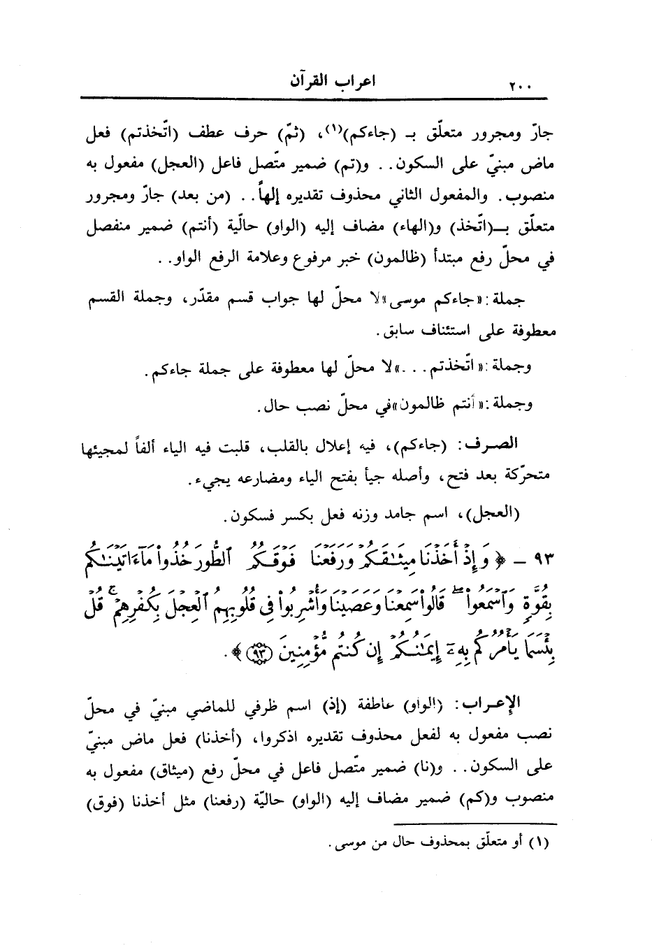 جارّ ومجرور متعلّق ب (جاءكم) «1» ، (ثمّ) حرف عطف (اتّخذتم) فعل ماض مبنيّ على السكون.. و (تم) ضمير متّصل فاعل (العجل) مفعول به منصوب. والمفعول الثاني محذوف تقديره إلها.. (من بعد) جارّ ومجرور متعلّق ب (اتّخذ) و (الهاء) مضاف إليه (الواو) حالّية (أنتم) ضمير منفصل في محلّ رفع مبتدأ (ظالمون) خبر مرفوع وعلامة الرفع الواو..