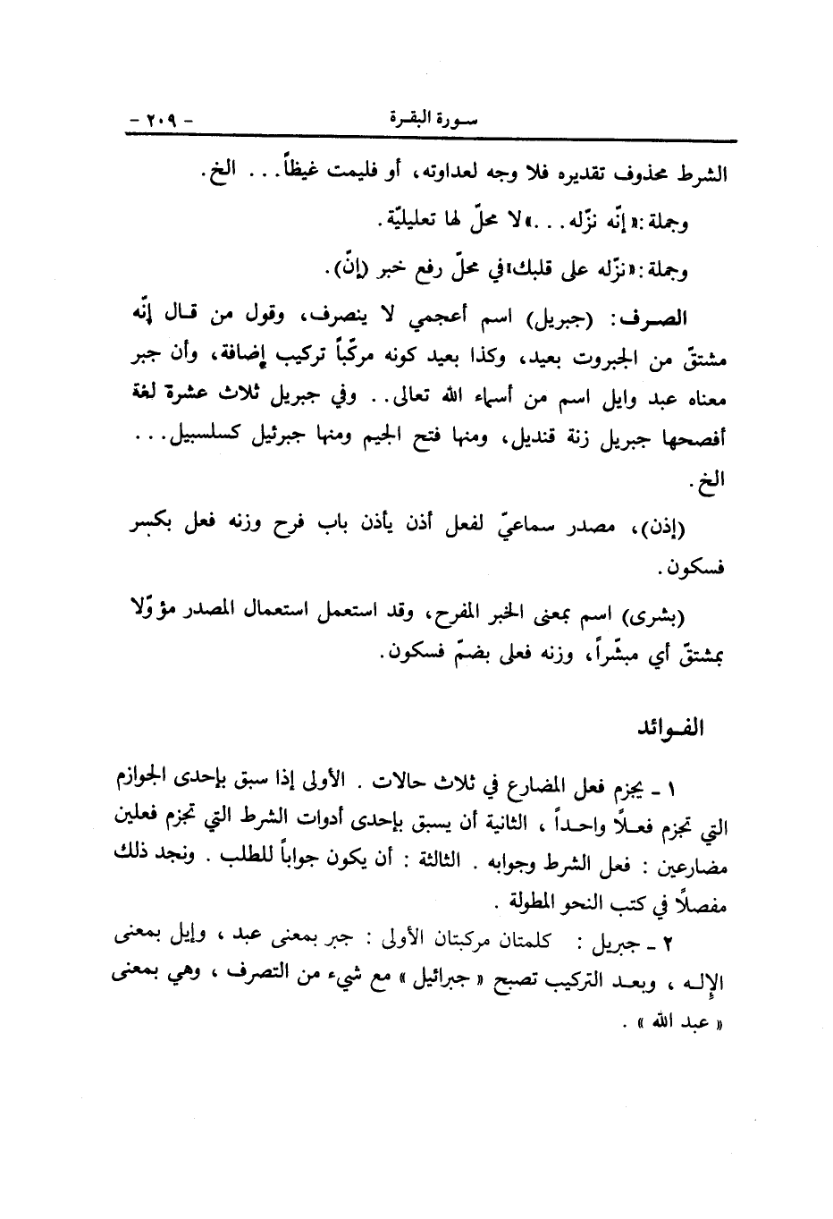 (جبريل) اسم أعجمي لا ينصرف، وقول من قال إنّه مشتقّ من الجبروت بعيد، وكذا بعيد كونه مركّبا تركيب إضافة، وأن جبر معناه عبد وايل اسم من أسماء الله تعالى.. وفي جبريل ثلاث عشرة لغة أفصحها جبريل زنة قنديل، ومنها فتح الجيم ومنها جبرئيل كسلسبيل ...