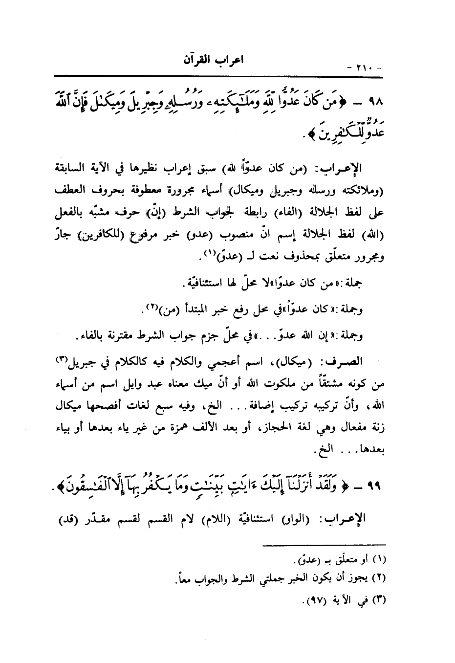 (من كان عدوّا لله) سبق إعراب نظيرها في الآية السابقة (وملائكته ورسله وجبريل وميكال) أسماء مجرورة معطوفة بحروف العطف على لفظ الجلالة (الفاء) رابطة لجواب الشرط (إنّ) حرف مشبّه بالفعل (الله) لفظ الجلالة اسم انّ منصوب (عدو) خبر مرفوع (للكافرين) جارّ ومجرور متعلّق بمحذوف نعت ل (عدوّ) «1» .
