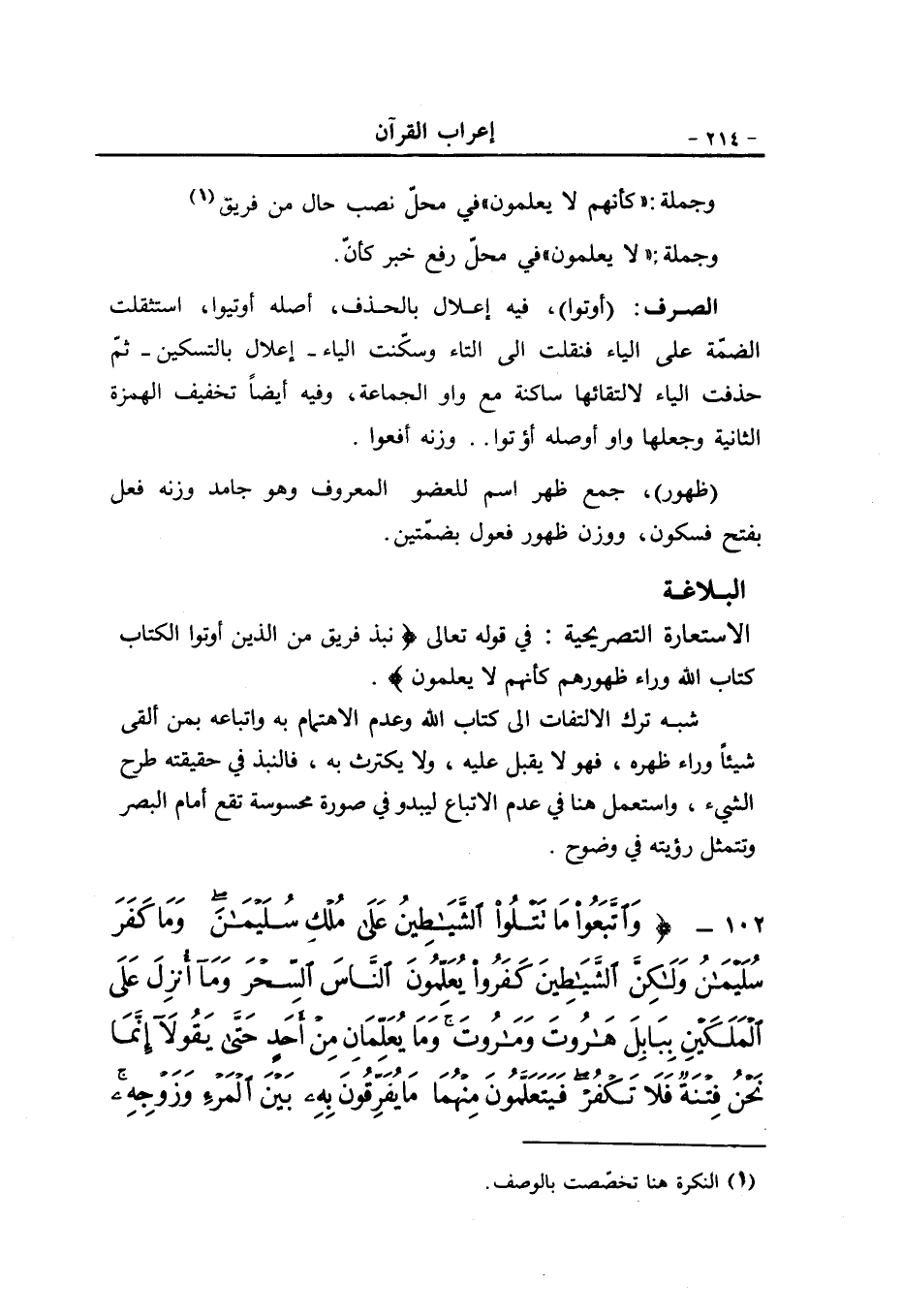وَاتَّبَعُوا ما تَتْلُوا الشَّياطِينُ عَلى مُلْكِ سُلَيْمانَ وَما كَفَرَ سُلَيْمانُ وَلكِنَّ الشَّياطِينَ كَفَرُوا يُعَلِّمُونَ النَّاسَ السِّحْرَ وَما أُنْزِلَ عَلَى الْمَلَكَيْنِ بِبابِلَ هارُوتَ وَمارُوتَ وَما يُعَلِّمانِ مِنْ أَحَدٍ حَتَّى يَقُولا إِنَّما نَحْنُ فِتْنَةٌ فَلا تَكْفُرْ فَيَتَعَلَّمُونَ مِنْهُما ما يُفَرِّقُونَ بِهِ بَيْنَ الْمَرْءِ وَزَوْجِهِ وَما هُمْ بِضارِّينَ بِهِ مِنْ أَحَدٍ إِلاَّ بِإِذْنِ اللَّهِ وَيَتَعَلَّمُونَ ما يَضُرُّهُمْ وَلا يَنْفَعُهُمْ وَلَقَدْ عَلِمُوا لَمَنِ اشْتَراهُ ما لَهُ فِي الْآخِرَةِ مِنْ خَلاقٍ وَلَبِئْسَ ما شَرَوْا بِهِ أَنْفُسَهُمْ لَوْ كانُوا يَعْلَمُونَ (102)