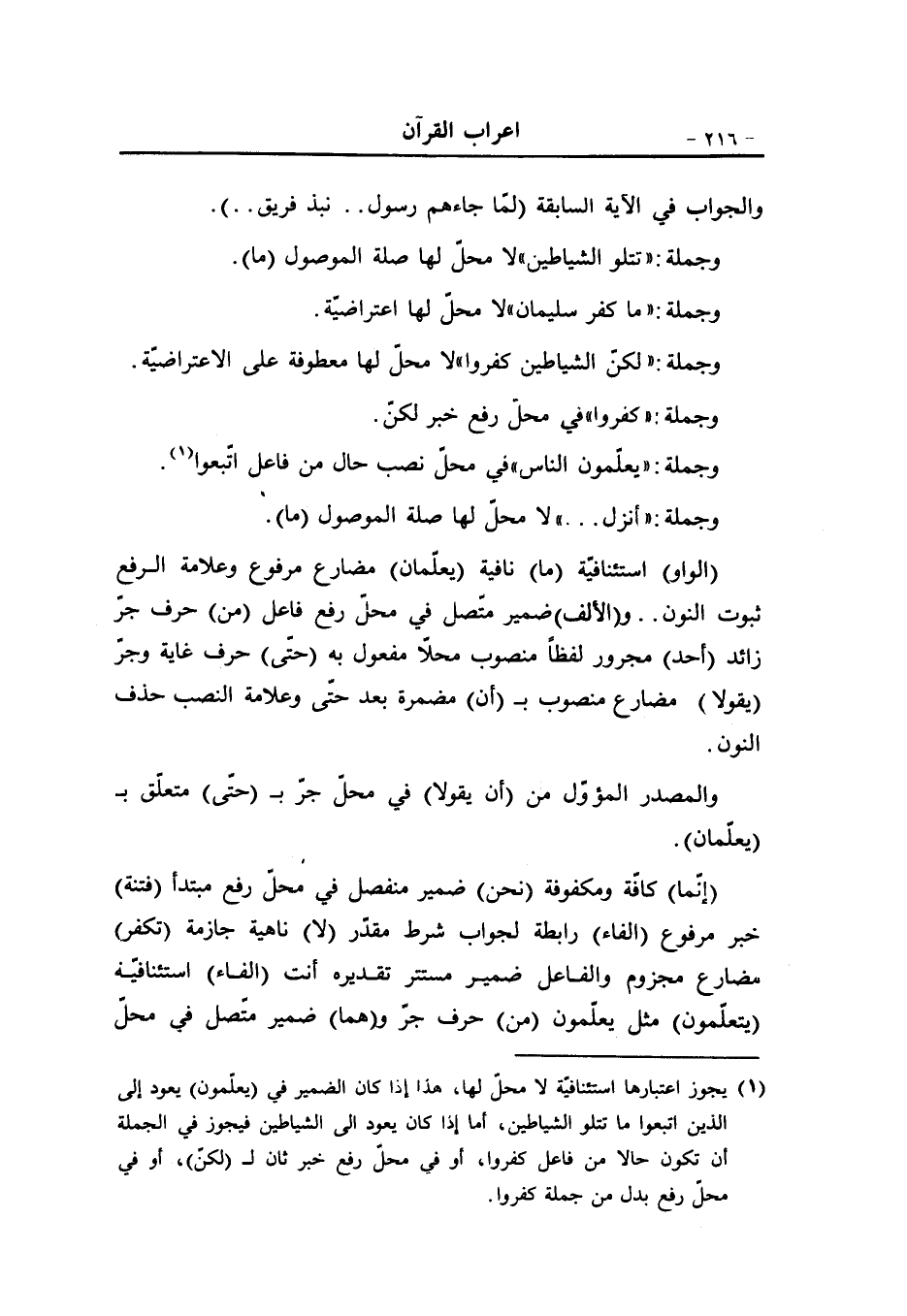 (1) يجوز اعتبارها استئنافيّة لا محلّ لها، هذا إذا كان الضمير في (يعلّمون) يعود إلى الذين اتبعوا ما تتلو الشياطين، أما إذا كان يعود الى الشياطين فيجوز في الجملة أن تكون حالا من فاعل كفروا، أو في محلّ رفع خبر ثان ل (لكنّ) ، أو في محلّ رفع بدل من جملة كفروا.