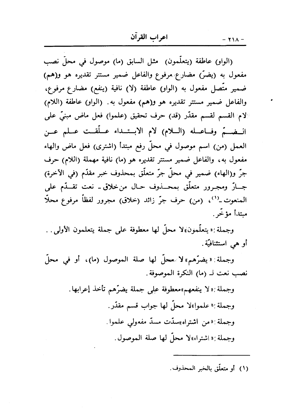 (الواو) عاطفة (يتعلّمون) مثل السابق (ما) موصول في محلّ نصب مفعول به (يضرّ) مضارع مرفوع والفاعل ضمير مستتر تقديره هو و (هم) ضمير متّصل مفعول به (الواو) عاطفة (لا) نافية (ينفع) مضارع مرفوع، والفاعل ضمير مستتر تقديره هو و (هم) مفعول به. (الواو) عاطفة (اللام) لام القسم لقسم مقدّر (قد) حرف تحقيق (علموا) فعل ماض مبنيّ على الضمّ وفاعله (اللام) لام الابتداء علّقت علم عن العمل (من) اسم موصول في محلّ رفع مبتدأ (اشترى) فعل ماض والهاء مفعول به، والفاعل ضمير مستتر تقديره هو (ما) نافية مهملة (اللام) حرف جرّ و (الهاء) ضمير في محلّ جرّ متعلّق بمحذوف خبر مقدّم (في الآخرة) جارّ ومجرور متعلّق بمحذوف حال من خلاق- نعت تقدّم على المنعوت- «1» ، (من) حرف جرّ زائد (خلاق) مجرور لفظا مرفوع محلّا مبتدأ مؤخّر.
