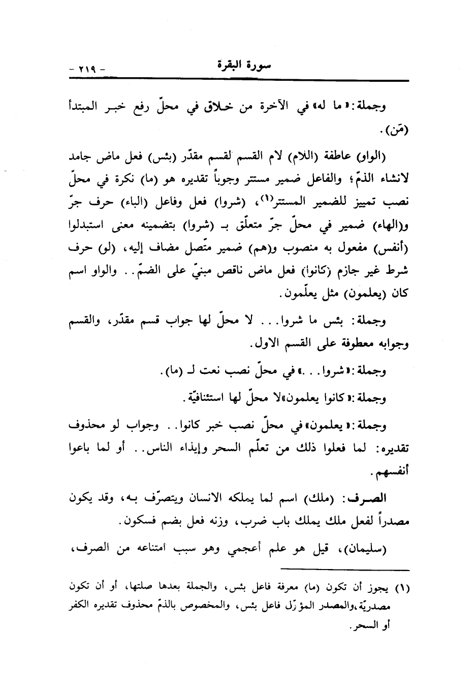 (1) يجوز أن تكون (ما) معرفة فاعل بئس، والجملة بعدها صلتها، أو أن تكون مصدريّة، والمصدر المؤوّل فاعل بئس، والمخصوص بالذمّ محذوف تقديره الكفر أو السحر.