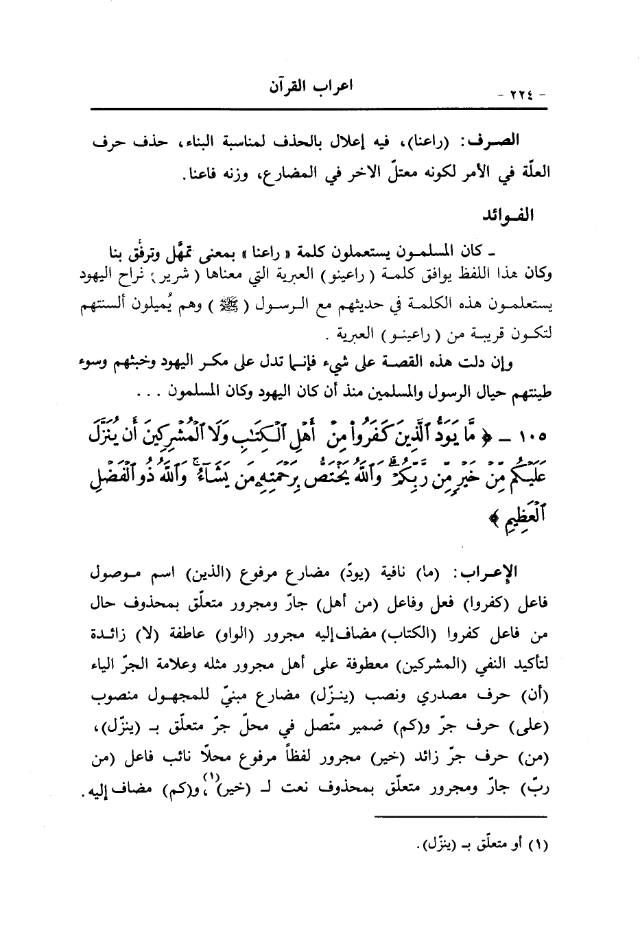 (ما) نافية (يودّ) مضارع مرفوع (الذين) اسم موصول فاعل (كفروا) فعل وفاعل (من أهل) جارّ ومجرور متعلّق بمحذوف حال من فاعل كفروا (الكتاب) مضاف إليه مجرور (الواو) عاطفة (لا) زائدة لتأكيد النفي (المشركين) معطوفة على أهل مجرور مثله وعلامة الجرّ الياء (أن) حرف مصدري ونصب (ينزّل) مضارع مبنيّ للمجهول منصوب (على) حرف جرّ و (كم) ضمير متّصل في محلّ جرّ متعلّق ب (ينزّل) ، (من) حرف جرّ زائد (خير) مجرور لفظا مرفوع محلّا نائب فاعل (من ربّ) جارّ ومجرور متعلّق بمحذوف نعت ل (خير) «1» ، و (كم) مضاف إليه.