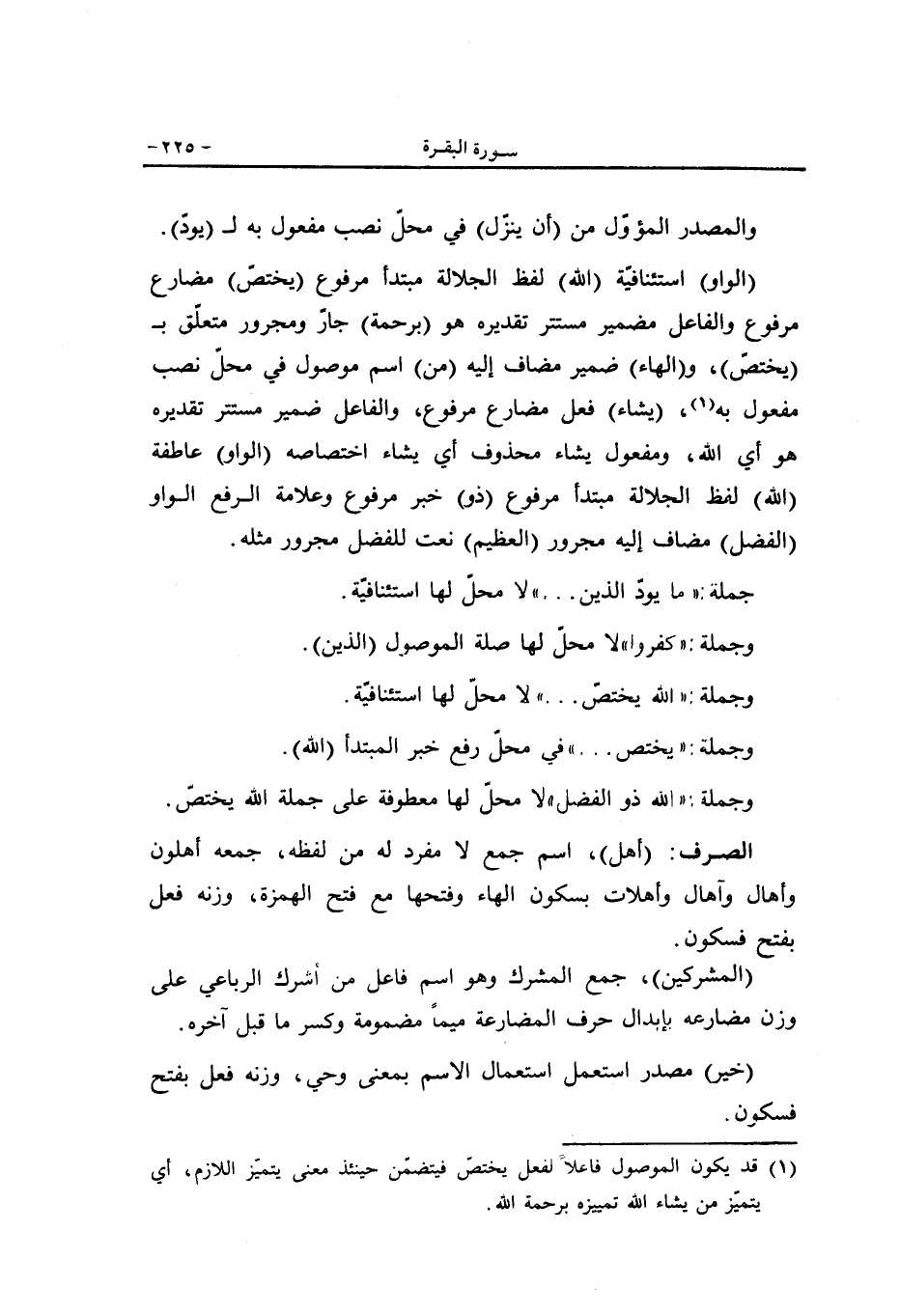 (الواو) استئنافيّة (الله) لفظ الجلالة مبتدأ مرفوع (يختصّ) مضارع مرفوع والفاعل ضمير مستتر تقديره هو (برحمة) جارّ ومجرور متعلّق ب (يختصّ) ، و (الهاء) ضمير مضاف إليه (من) اسم موصول في محلّ نصب مفعول به «1» ، (يشاء) فعل مضارع مرفوع، والفاعل ضمير مستتر تقديره هو أي الله، ومفعول يشاء محذوف أي يشاء اختصاصه (الواو) عاطفة (الله) لفظ الجلالة مبتدأ مرفوع (ذو) خبر مرفوع وعلامة الرفع الواو (الفضل) مضاف إليه مجرور (العظيم) نعت للفضل مجرور مثله.