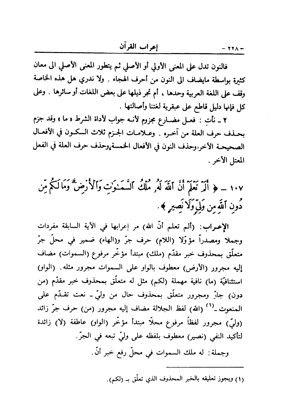 (ألم تعلم أنّ الله) مر إعرابها في الآية السابقة مفردات وجملا ومصدرا مؤوّلا (اللام) حرف جرّ و (الهاء) ضمير في محلّ جرّ متعلّق بمحذوف خبر مقدّم (ملك) مبتدأ مؤخّر مرفوع (السموات) مضاف إليه مجرور (الأرض) معطوف بالواو على السموات مجرور مثله. (الواو) استئنافيّة (ما) نافية مهملة (لكم) مثل له متعلّق بمحذوف خبر مقدّم (من دون) جارّ ومجرور متعلّق بمحذوف حال من وليّ- نعت تقدّم على المنعوت- «1» (الله) لفظ الجلالة مضاف إليه مجرور (من) حرف جرّ زائد (وليّ) مجرور لفظا مرفوع محلّا مبتدأ مؤخّر (الواو) عاطفة (لا) زائدة لتأكيد النفي (نصير) معطوف بلفظه على وليّ تبعه في الجرّ.