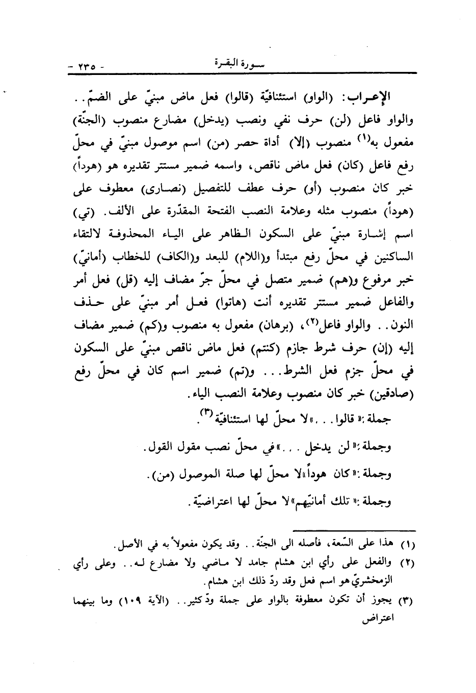 والواو فاعل (لن) حرف نفي ونصب (يدخل) مضارع منصوب (الجنّة) مفعول به «1» منصوب (إلا) أداة حصر (من) اسم موصول مبنيّ في محلّ رفع فاعل (كان) فعل ماض ناقص، واسمه ضمير مستتر تقديره هو (هودا) خبر كان منصوب (أو) حرف عطف للتفصيل (نصارى) معطوف على (هودا) منصوب مثله وعلامة النصب الفتحة المقدّرة على الألف. (تي) اسم إشارة مبنيّ على السكون الظاهر على الياء المحذوفة لالتقاء الساكنين في محلّ رفع مبتدأ و (اللام) للبعد و (الكاف) للخطاب (أمانيّ) خبر مرفوع و (هم) ضمير متصل في محلّ جرّ مضاف إليه (قل) فعل أمر والفاعل ضمير مستتر تقديره أنت (هاتوا) فعل أمر مبنيّ على حذف النون.. والواو فاعل «2» ، (برهان) مفعول به منصوب و (كم) ضمير مضاف إليه (إن) حرف شرط جازم (كنتم) فعل ماض ناقص مبنيّ على السكون في محلّ جزم فعل الشرط ... و (تم) ضمير اسم كان في محلّ رفع (صادقين) خبر كان منصوب وعلامة النصب الياء.