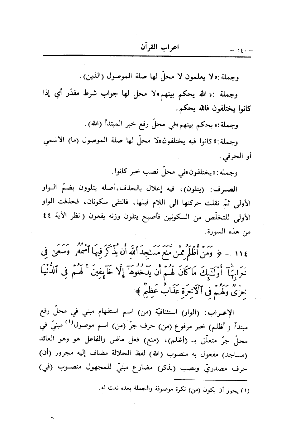 (الواو) استئنافيّة (من) اسم استفهام مبني في محلّ رفع مبتدأ (أظلم) خبر مرفوع (من) حرف جرّ (من) اسم موصول «1» مبنيّ في محلّ جرّ متعلّق ب (أظلم) ، (منع) فعل ماض والفاعل هو وهو العائد (مساجد) مفعول به منصوب (الله) لفظ الجلالة مضاف إليه مجرور (أن) حرف مصدريّ ونصب (يذكر) مضارع مبنيّ للمجهول منصوب (في)