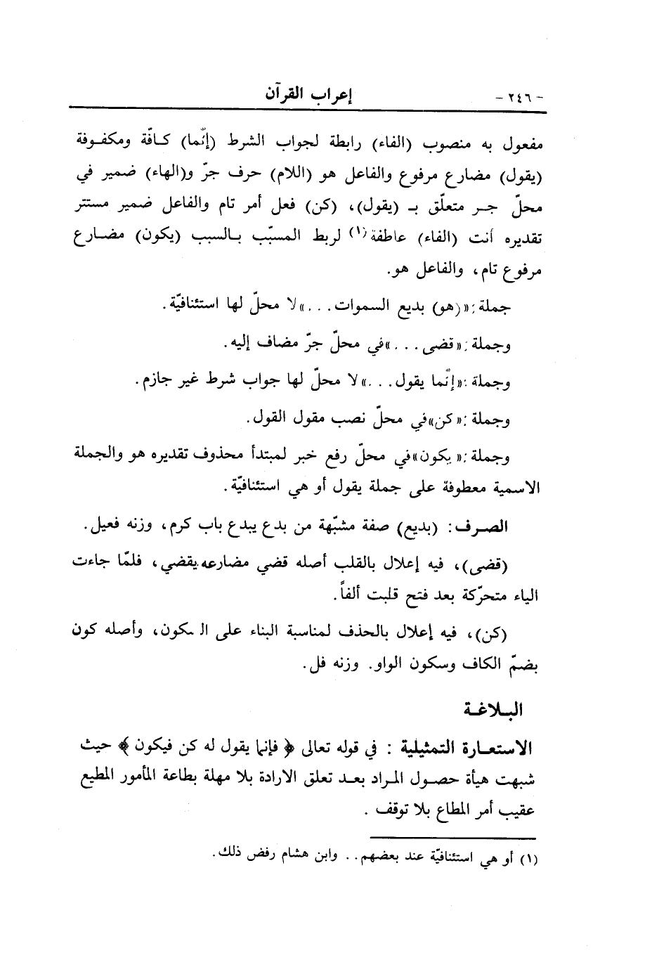 مفعول به منصوب (الفاء) رابطة لجواب الشرط (إنّما) كافّة ومكفوفة (يقول) مضارع مرفوع والفاعل هو (اللام) حرف جرّ و (الهاء) ضمير في محلّ جر متعلّق ب (يقول) ، (كن) فعل أمر تام والفاعل ضمير مستتر تقديره أنت (الفاء) عاطفة «1» لربط المسبّب بالسبب (يكون) مضارع مرفوع تام، والفاعل هو.