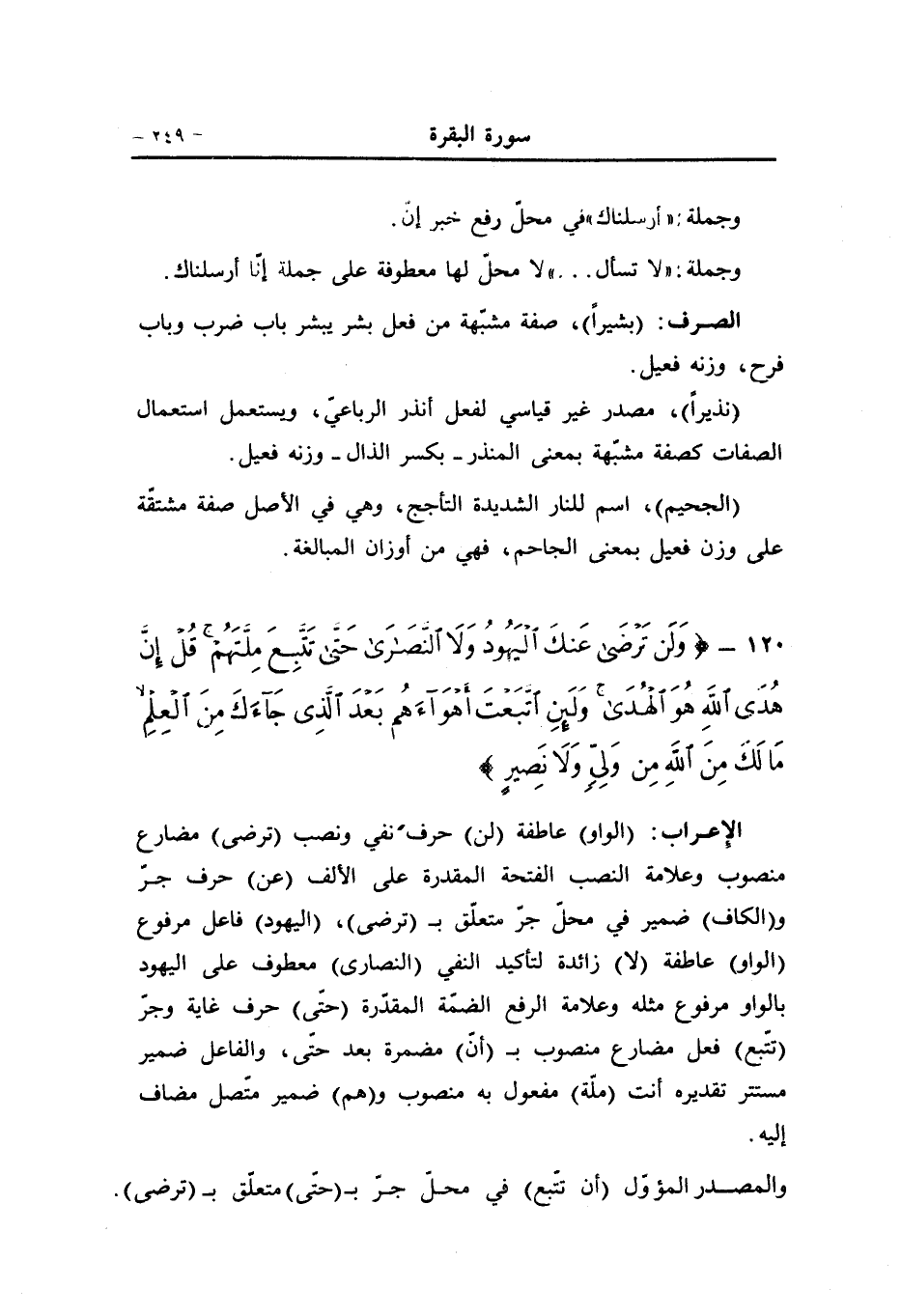 (الواو) عاطفة (لن) حرف نفي ونصب (ترضى) مضارع منصوب وعلامة النصب الفتحة المقدرة على الألف (عن) حرف جرّ و (الكاف) ضمير في محلّ جرّ متعلّق ب (ترضى) ، (اليهود) فاعل مرفوع (الواو) عاطفة (لا) زائدة لتأكيد النفي (النصارى) معطوف على اليهود بالواو مرفوع مثله وعلامة الرفع الضمّة المقدّرة (حتّى) حرف غاية وجرّ (تتّبع) فعل مضارع منصوب ب (أنّ) مضمرة بعد حتّى، والفاعل ضمير مستتر تقديره أنت (ملّة) مفعول به منصوب و (هم) ضمير متّصل مضاف إليه.