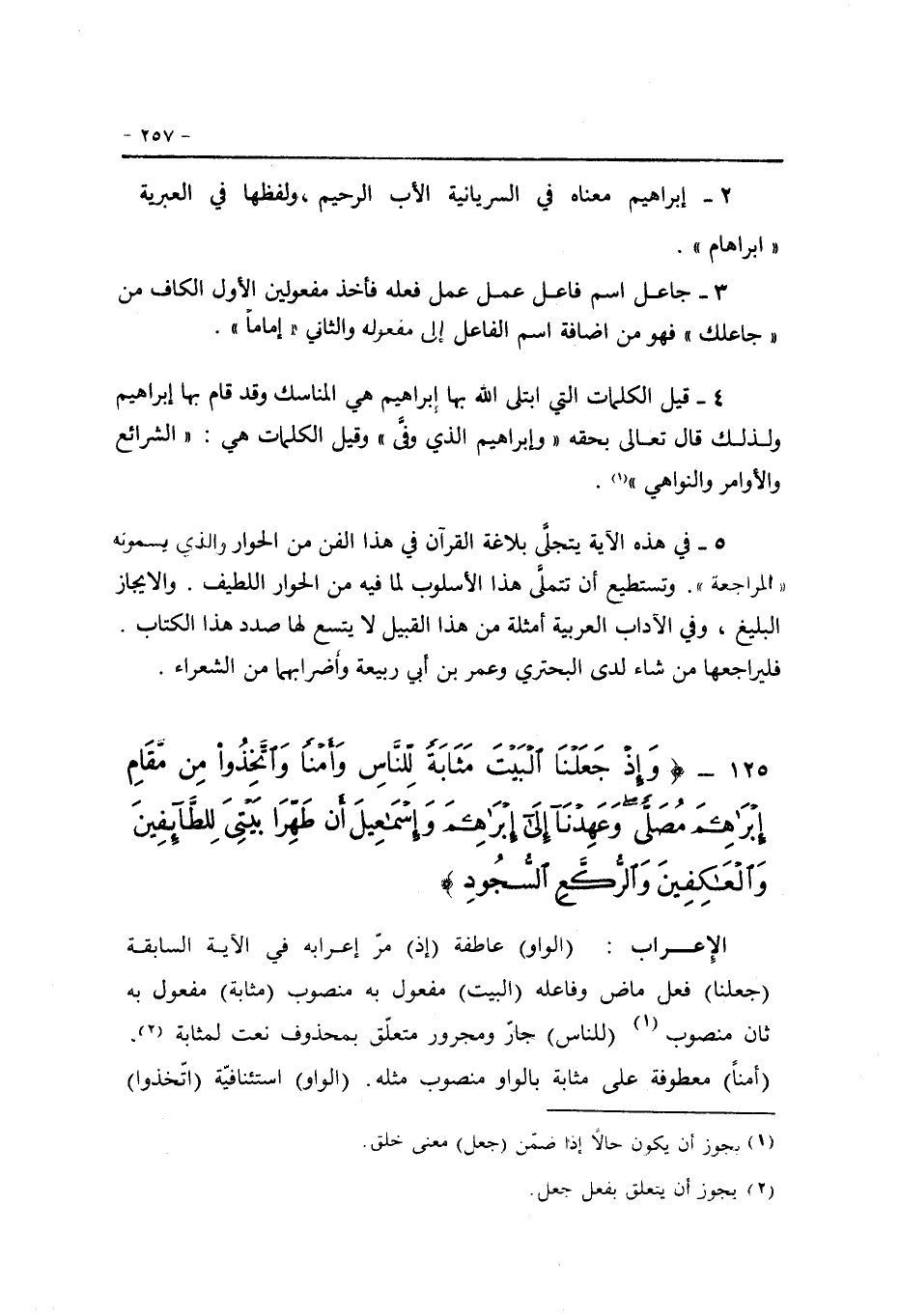 (الواو) عاطفة (إذ) مرّ إعرابه في الآية السابقة (جعلنا) فعل ماض وفاعله (البيت) مفعول به منصوب (مثابة) مفعول به ثان منصوب «1» (للناس) جارّ ومجرور متعلّق بمحذوف نعت لمثابة «2» ، (أمنا) معطوفة على مثابة بالواو منصوب مثله. (الواو) استئنافيّة (اتّخذوا)
