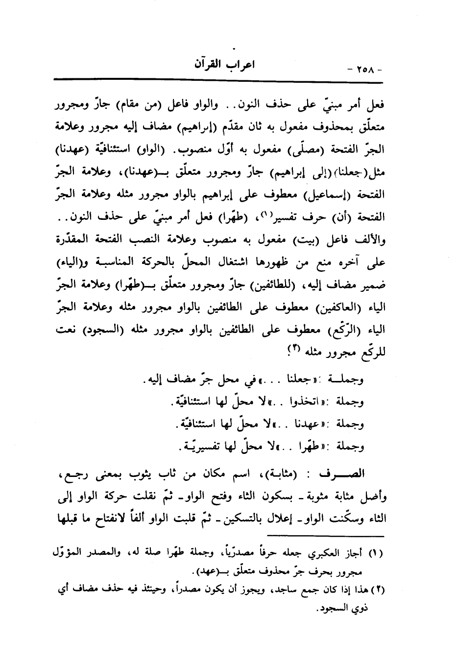 فعل أمر مبنيّ على حذف النون.. والواو فاعل (من مقام) جارّ ومجرور متعلّق بمحذوف مفعول به ثان مقدّم (إبراهيم) مضاف إليه مجرور وعلامة الجرّ الفتحة (مصلّى) مفعول به أوّل منصوب. (الواو) استئنافيّة (عهدنا) مثل (جعلنا) (إلى إبراهيم) جارّ ومجرور متعلّق ب (عهدنا) ، وعلامة الجرّ الفتحة (إسماعيل) معطوف على إبراهيم بالواو مجرور مثله وعلامة الجرّ الفتحة (أن) حرف تفسير «1» ، (طهّرا) فعل أمر مبنيّ على حذف النون..