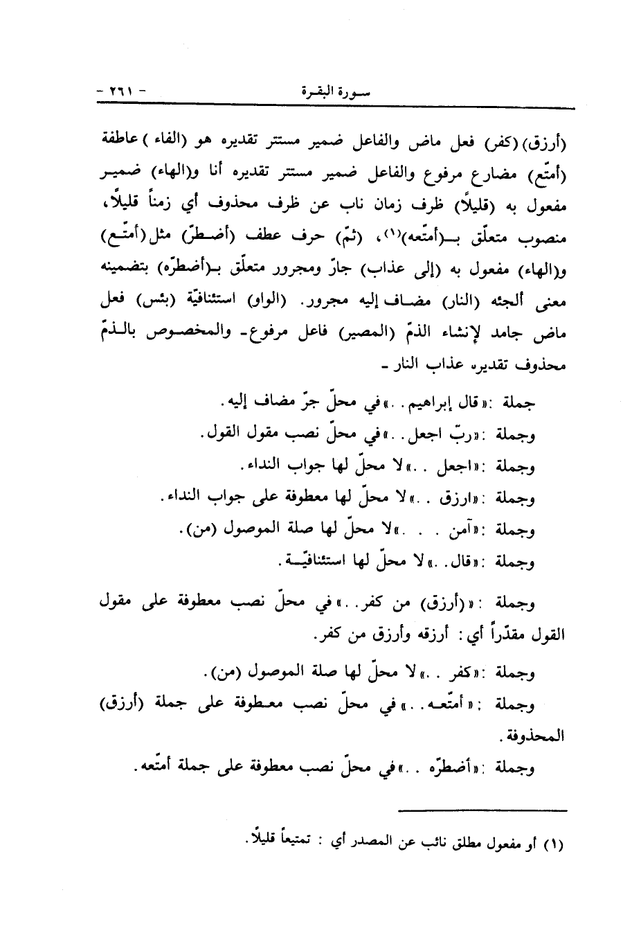 (أرزق) (كفر) فعل ماض والفاعل ضمير مستتر تقديره هو (الفاء) عاطفة (أمتّع) مضارع مرفوع والفاعل ضمير مستتر تقديره أنا و (الهاء) ضمير مفعول به (قليلا) ظرف زمان ناب عن ظرف محذوف أي زمنا قليلا، منصوب متعلّق ب (أمتّعه) «1» ، (ثمّ) حرف عطف (أضطرّ) مثل (أمتّع) و (الهاء) مفعول به (إلى عذاب) جارّ ومجرور متعلّق ب (أضطرّه) بتضمينه معنى ألجئه (النار) مضاف إليه مجرور. (الواو) استئنافيّة (بئس) فعل ماض جامد لإنشاء الذمّ (المصير) فاعل مرفوع- والمخصوص بالذمّ محذوف تقديره عذاب النار- جملة: «قال إبراهيم..» في محلّ جرّ مضاف إليه.